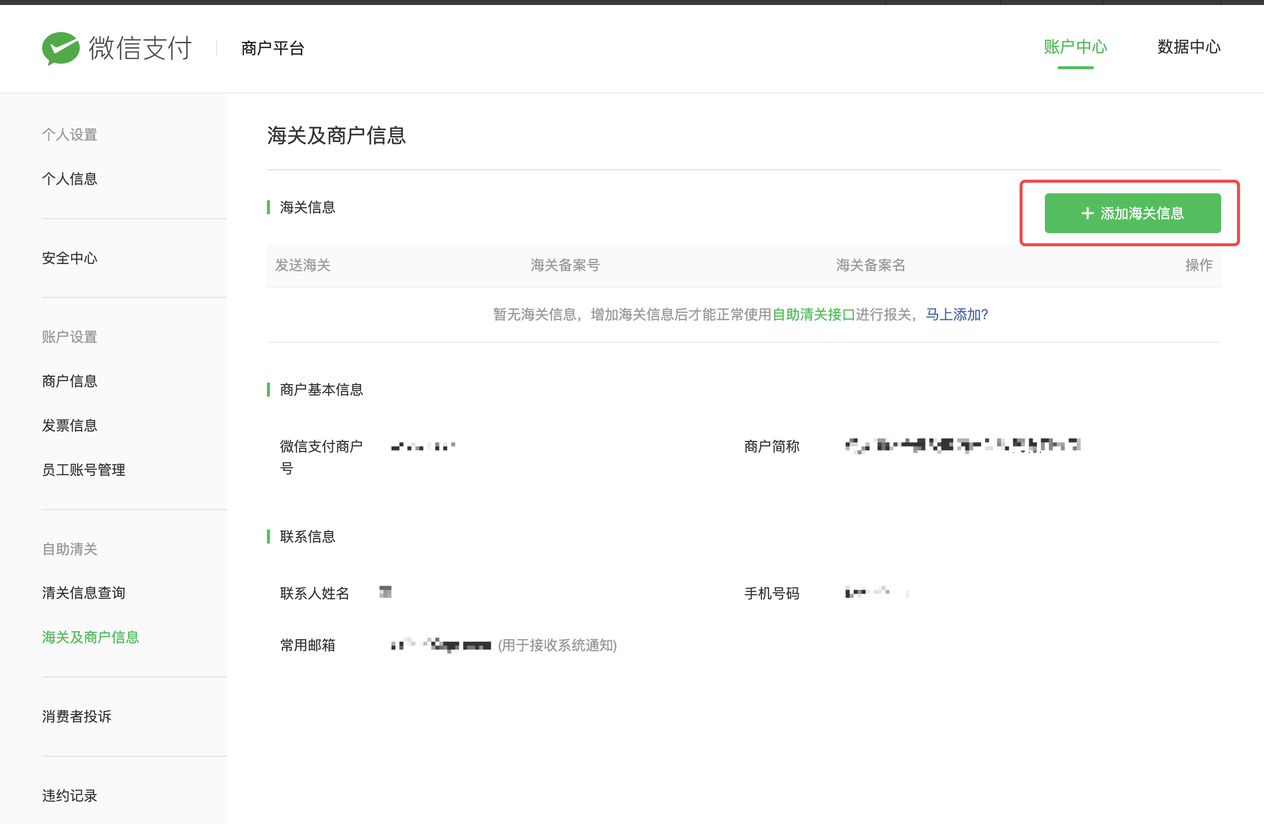 四、点击「账户中心」或者重新登录商户号后,你会发现左侧菜单已经出现了自助清关产品的「海关信息查询」和「海关及商户信息」入口,此时需要依次点击「海关及商户信息」->「添加海关信息」进行海关信息添加