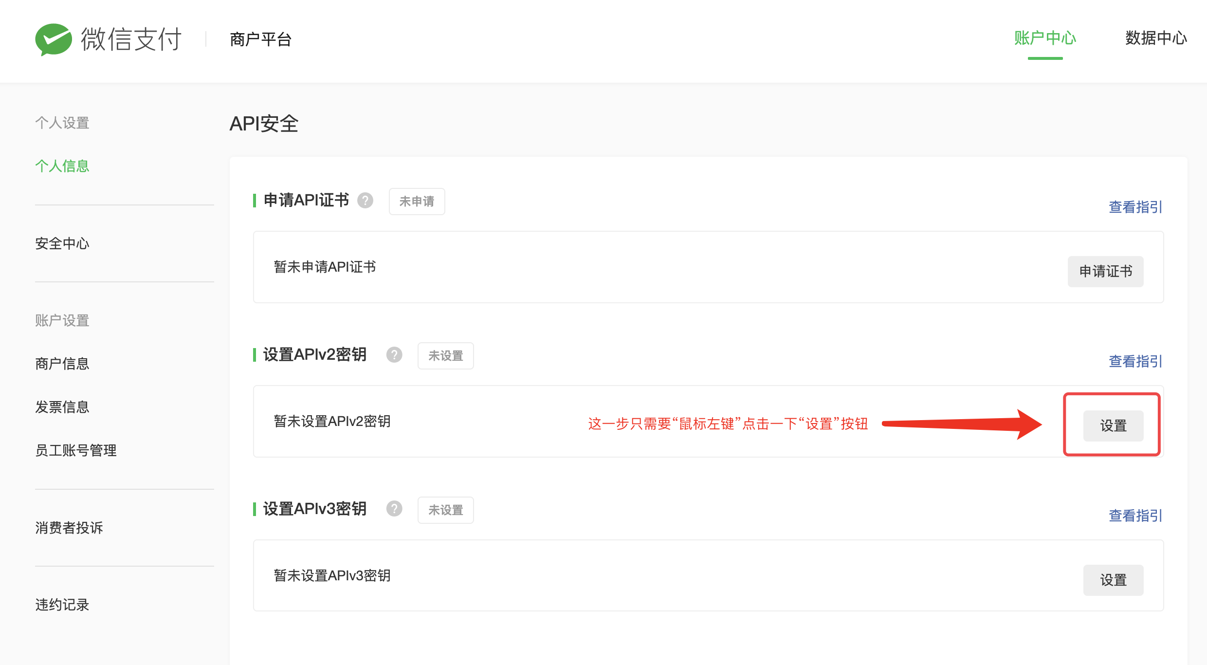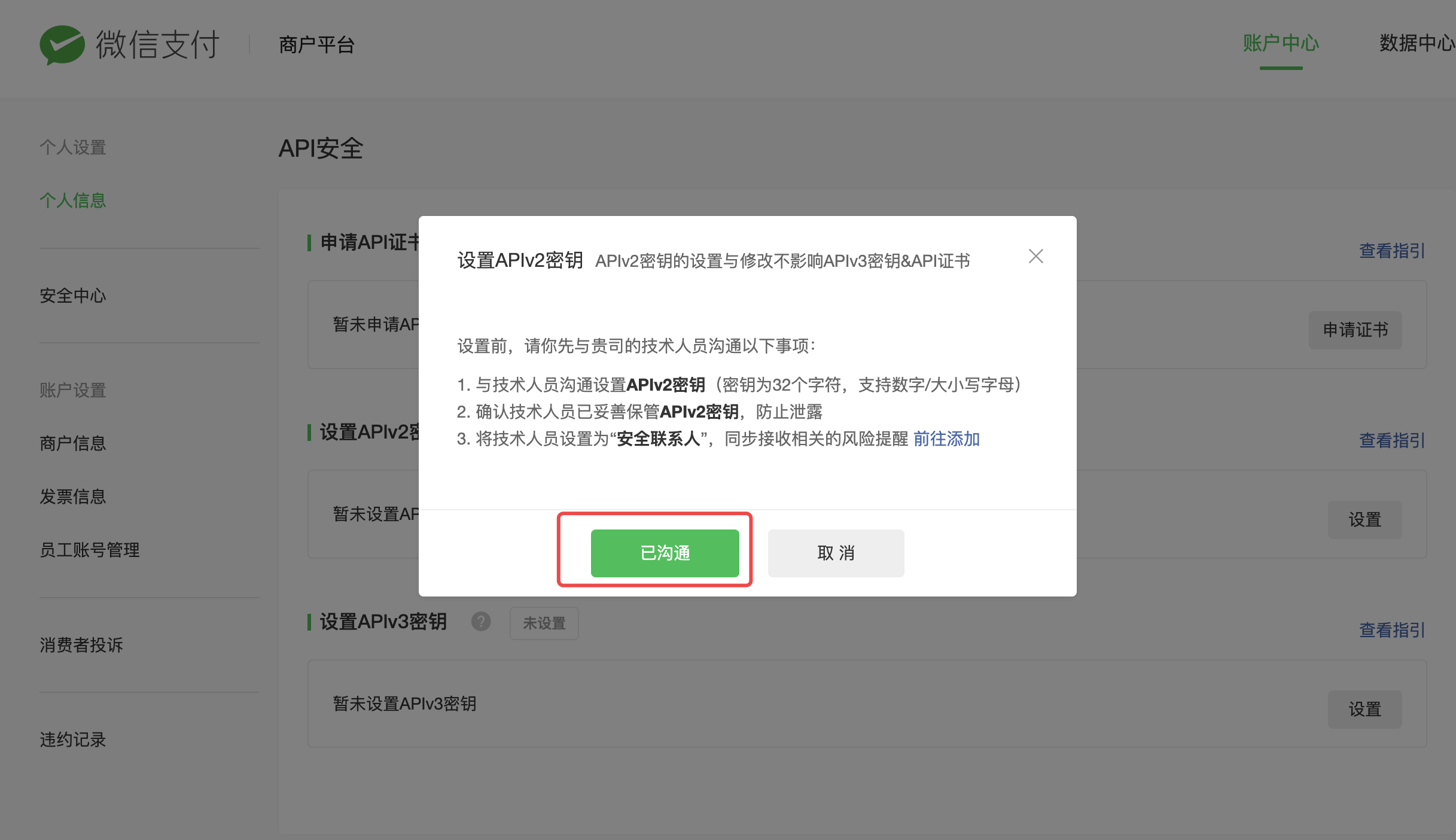 2.2 在「API安全页」点击API V2密钥后面的「设置」按钮,在弹出提示选择「已沟通」按钮进入密钥设置页面
