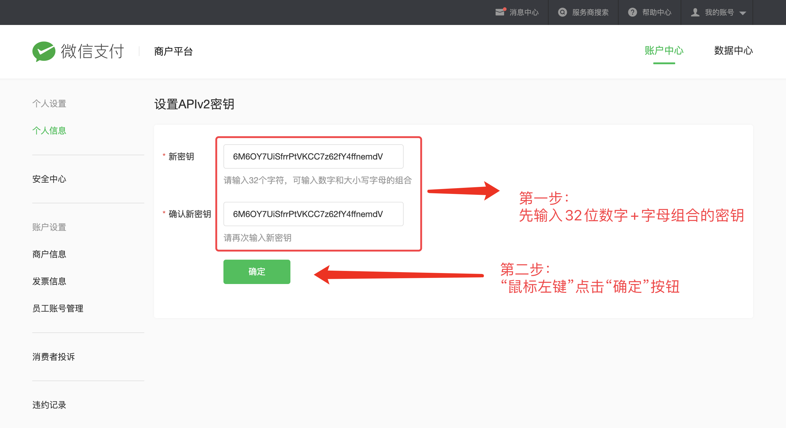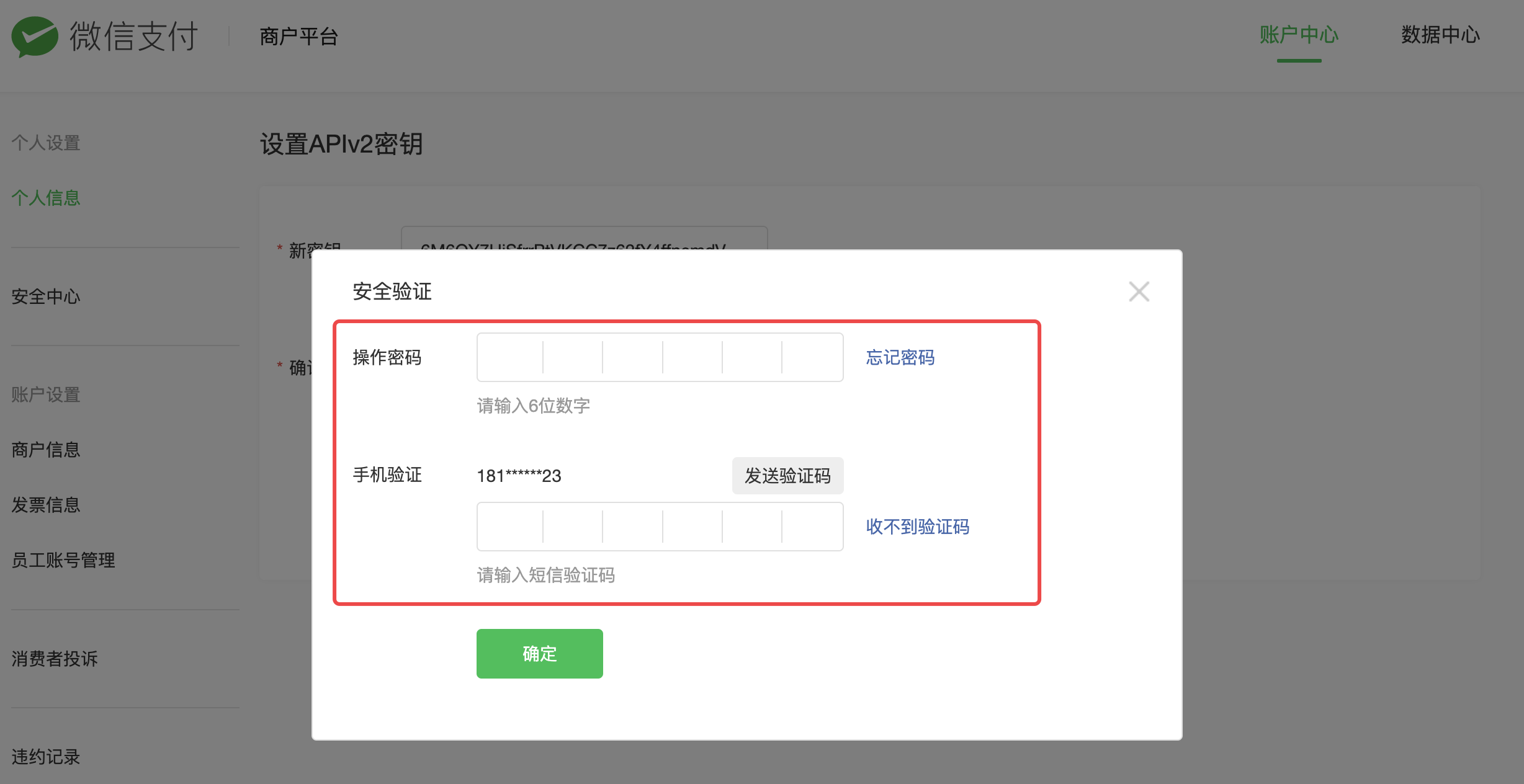 2.3 先输入32位密钥(支持数字+大小写字母组合),然后点击“确定”按钮,在弹出的安全验证中输入之前设置好的“6位数数字的操作密码”和“短信验证码”确定后即可设置成功API V2密钥