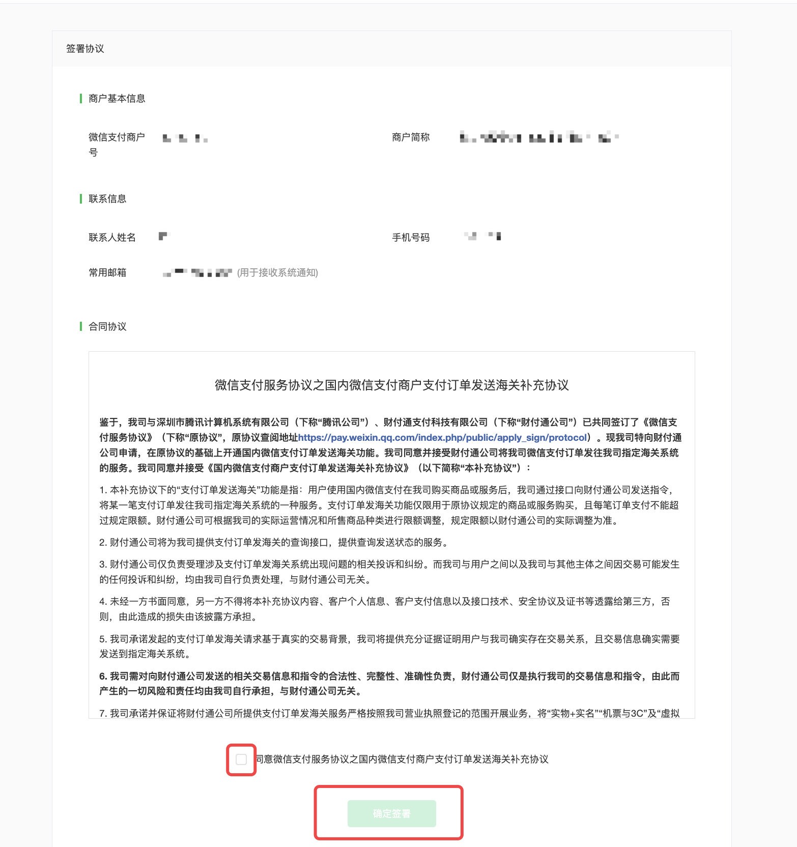 三、「点我」进入「自助清关」产品开通协议签署页面,勾选同意开通协议后,点击「确定签署」,签署「自助清关」协议