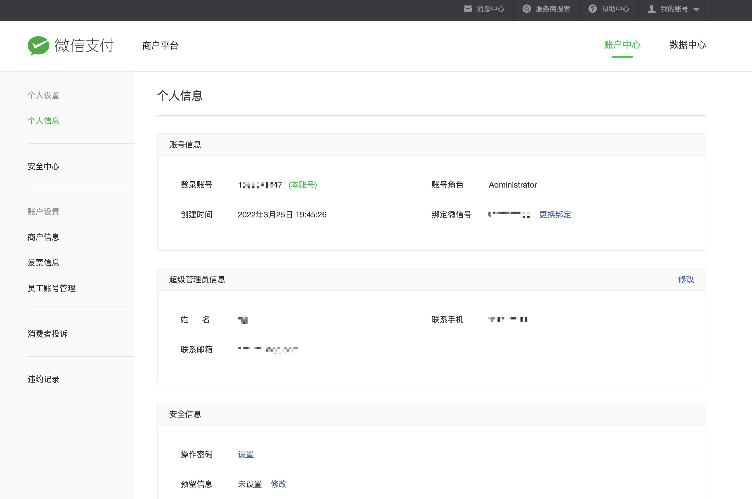 注:扫码登录商户后台以后所看到的界面如下图所示为二级商户号后台,只有“账户中心”和“数据中心”两个入口