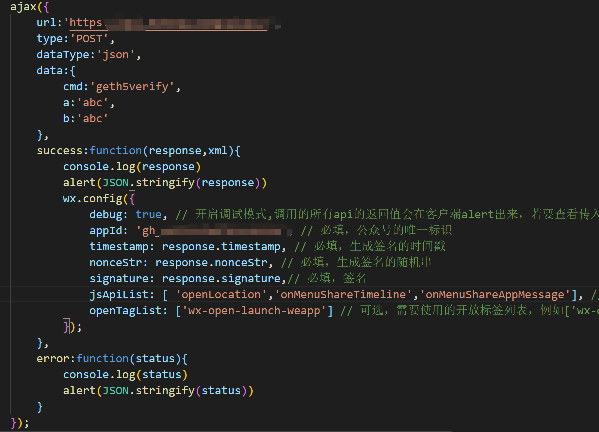 debug: true, // 开启调试模式,调用的所有api的返回值会在客户端alert出来,若要查看传入的参数,可以在pc端打开,参数信息会通过log打出,仅在pc端时才会打印