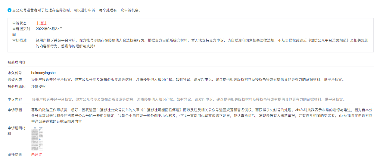 我本次申诉很委屈,我是一个每天都认真作业的小白用户,咔嚓一声就将本公众号给予封禁。平台难道不是应该多给予用户们多一些申诉内容吗?给予问题处理的条件下,不就是应该积极帮平台用户解决问题吗?但我从本次申诉事件中并有未感受到微信公众号平台给与用户该有的权益,且第一次就给本公众号直接封禁。我很珍惜我的每一位粉丝,他们是“白猫影社”公众号良师益友,是陪我度过了最艰难的如似家人,我恳求尊敬的微信公众号平台及友善的审核员能够再次公平公正地审核我的“白猫影社”公众号诉求,请给我一次机会,请再爱我一次。(鞠躬 我希望微信公众号官方能够多倾听平台用户诉求,让跟我命运相同遭遇的用户有释怀之地,在此恳请尊敬的公众号审核员,能够好好去审核公众号每一个申诉用户的诉讼问题,这对于他们苦心经运的公众号来说非常的重要,我每篇 “白猫日记” 都有记录自己生活内容,都是我真真实实的故事,我发表本次文章是因为我想让官方能够听见我的心声,就算我有过错但真不至于永封,从申诉方面我感觉官方应该从问题的多方面进行相关的处理,并不是单方面的只听投诉方的诉求,这会让很多申诉用户感到非常的不公和伤痛不已,希望官方能再次严格的处理此事并还我个公道,我从未有过贩卖盗版资源以及发布文章的侵权内容,恳求官方重新审核我的申诉处理,公众号上的运营问题,我确实存在一些瑕疵,即使本次诉讼后会从轻处罚我也认,但是现在这个结果对于我来说是不公的,望官方查看我提供的网络证据以及微信用户多次发文诉说的内容后,能重新给予本号一次重新改过的机会或从轻处罚,白猫在此承诺解封后会时刻会遵守微信公众号的每一条规则及使用条例,即使是小错误也是不对的,在此特别感谢能为我处理本次审核的公众号人员。(鞠躬