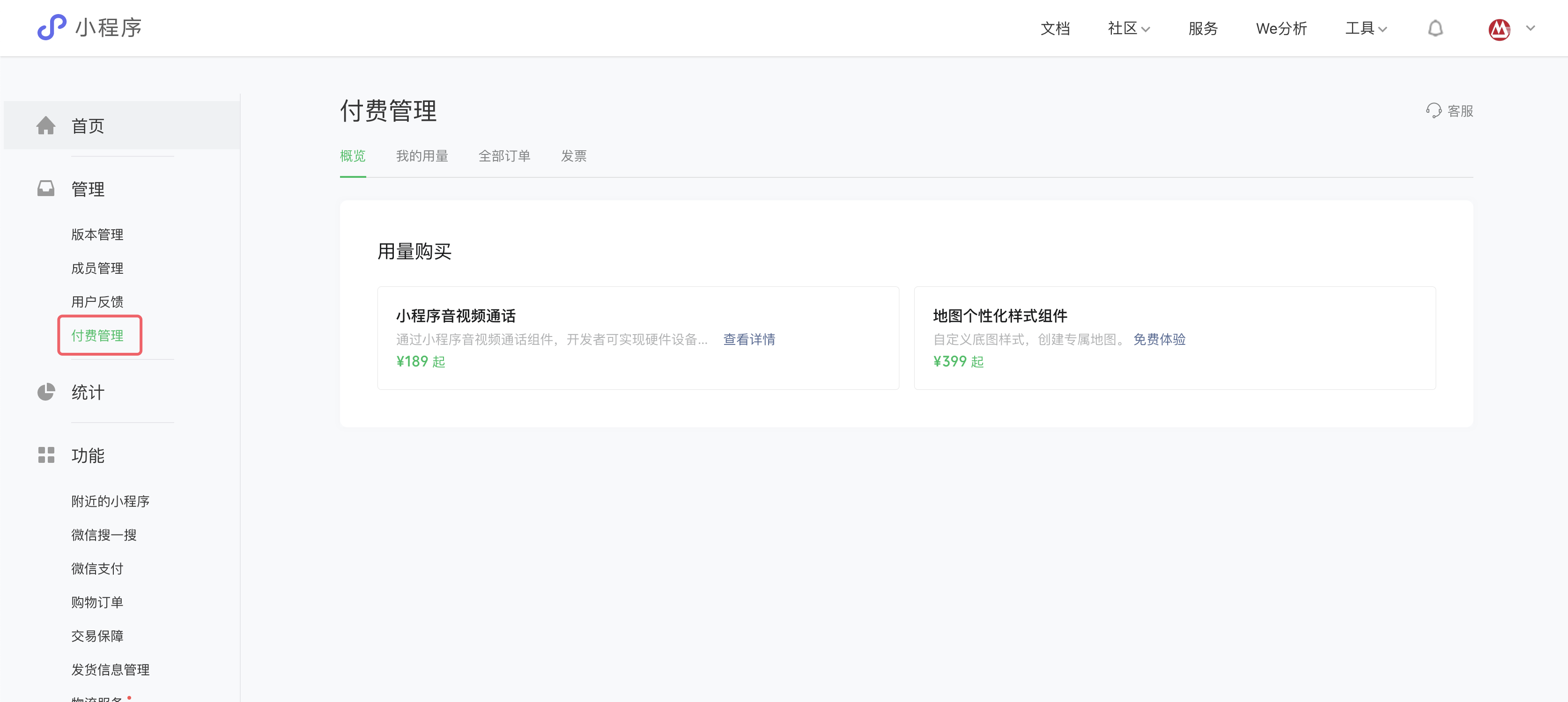 据官方文档说明:小程序有丰富的开放能力,其中,由于技术服务与运营成本原因,部分能力需付费使用,开发者可根据小程序自身业务场景需要而选择购买。付费管理模块,承载开发者在小程序里购买各项付费能力,管理订单和用量,开具发票的功能。