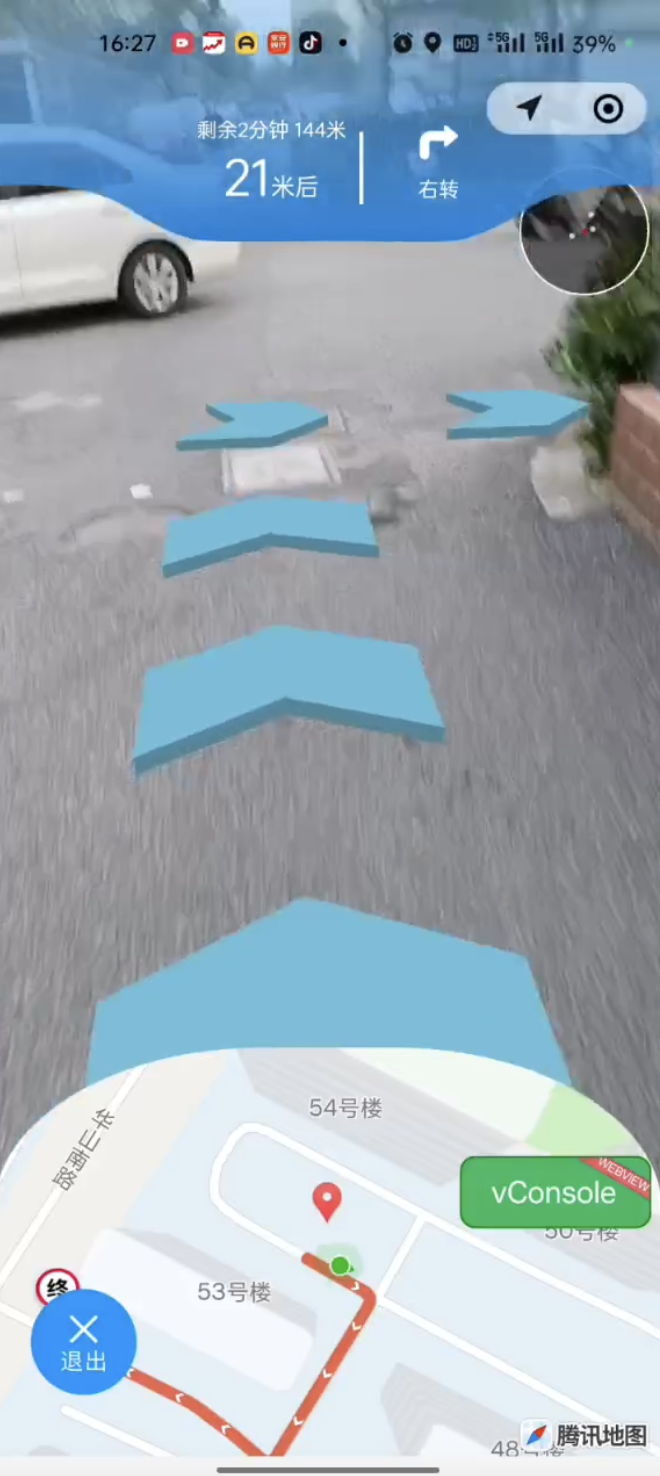 我们也提供了个地图AR导航插件,有兴趣欢迎使用体验:https://mp.weixin.qq.com/wxopen/pluginbasicprofile?action=intro&appid=wx0b07b21a83347243&token=1174285323&lang=zh_CN 初版后续会不断完善