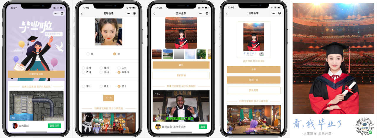 疫情原因,2020年的毕业季也变得不一样了,在这个特殊的时期,课程、面试、答辩,甚至是告别都要在网上进行,网友将此称为“云毕业”。为了弥补遗憾,特推出云毕业照小程序.