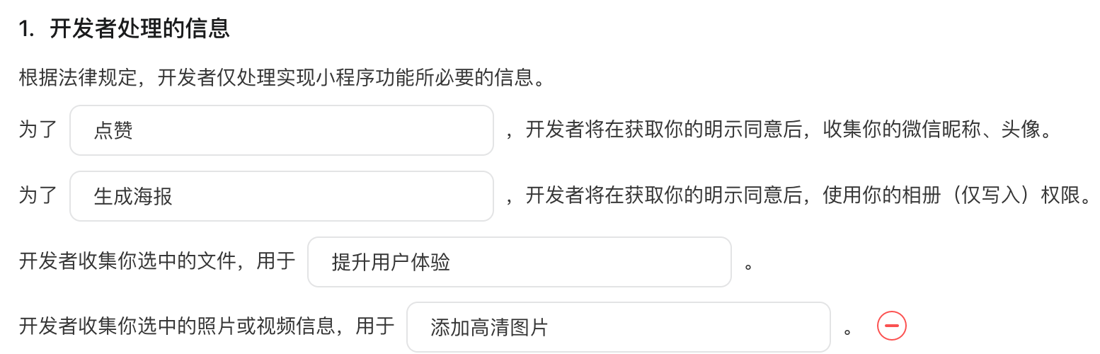 3.需要在小程序后台隐私政策申请以下能力:头像、昵称+相册权限+获取照片视频能力。否则部分功能无效果
