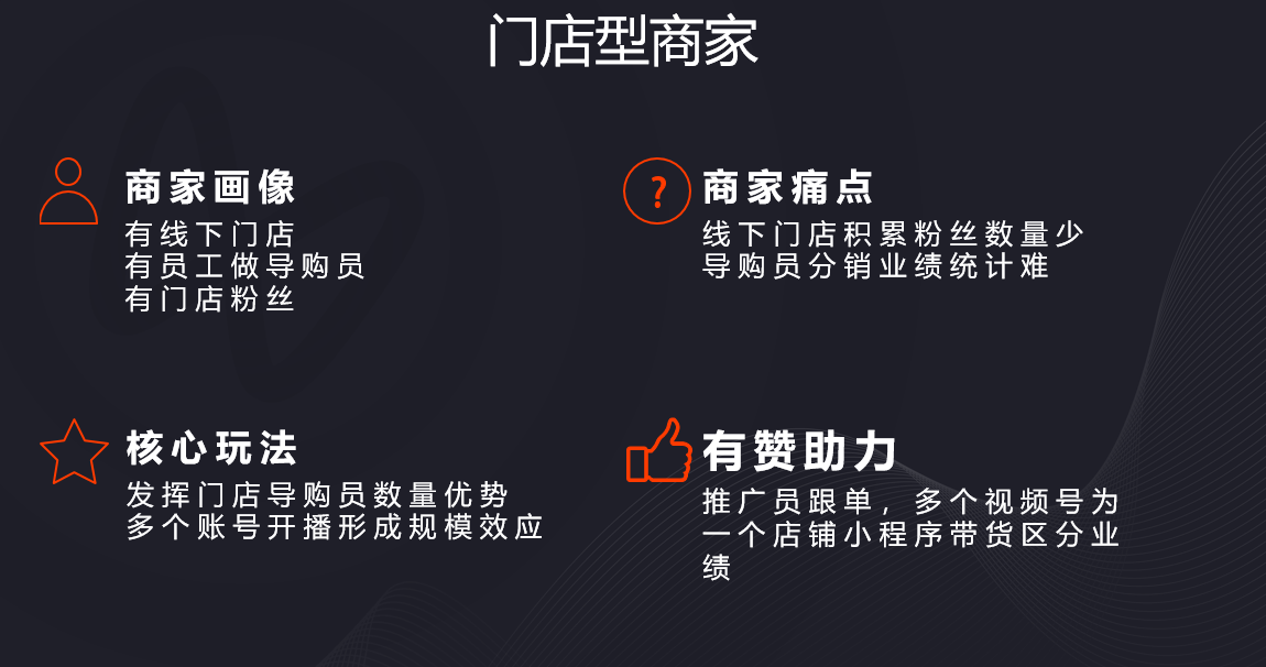 第三类是诸如王府井百货、远梦生活商城等在内的门店型商家。门店型商家的视频号运营难点在于导购员分销业绩难以统计,无法发挥发力导购私域价值。对此,有赞产品上线了“推广员跟单功能”,支持“多个导购直播间为一个店铺小程序带货”。