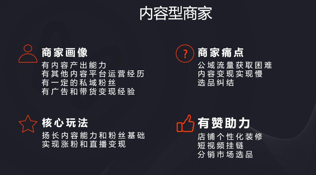 第一种是内容型商家。这类商家以自媒体与短视频达人群体为主,诸如十点读书、辣妈学院等。其核心玩法是最大化利用优质的内容能力和粉丝基础,进行直播变现。而这类商家遇到的主要问题是,公域流量获取效率低,以及没有靠谱的供应链。对此,有赞能提供分销市场的供应链支持,解决商家货源问题。