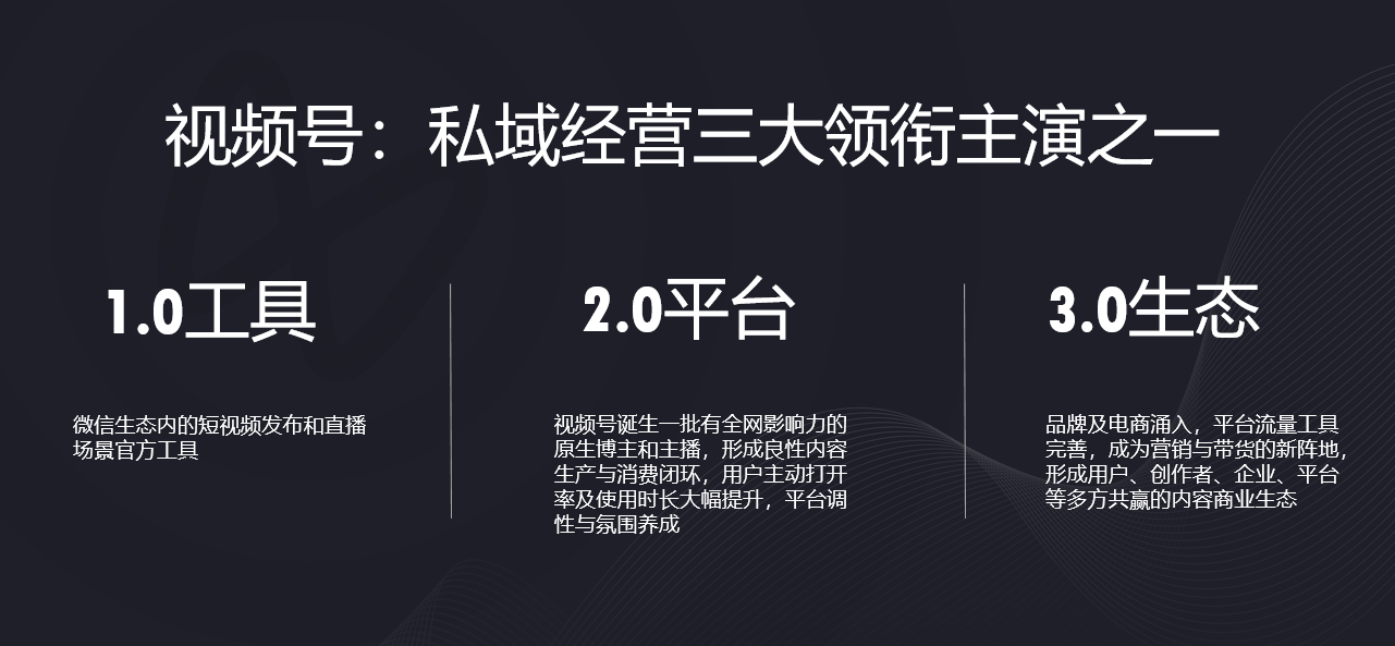 “在整个私域经营里,目前有三大领衔主演,即视频号、企业微信、小程序。当下,人们更多把视频号当做微信生态短视频发布和直播工具;而到2.0阶段,随着更多有影响力的视频号原生创作者的诞生,视频号平台调性与氛围会逐步形成;当众多创作者、电商不断涌入,平台流量工具完善,视频号将进入3.0阶段,成为营销与带货的新阵地,形成用户、创作者、企业、平台等多方共赢的内容商业生态。”闫冬如是说。
