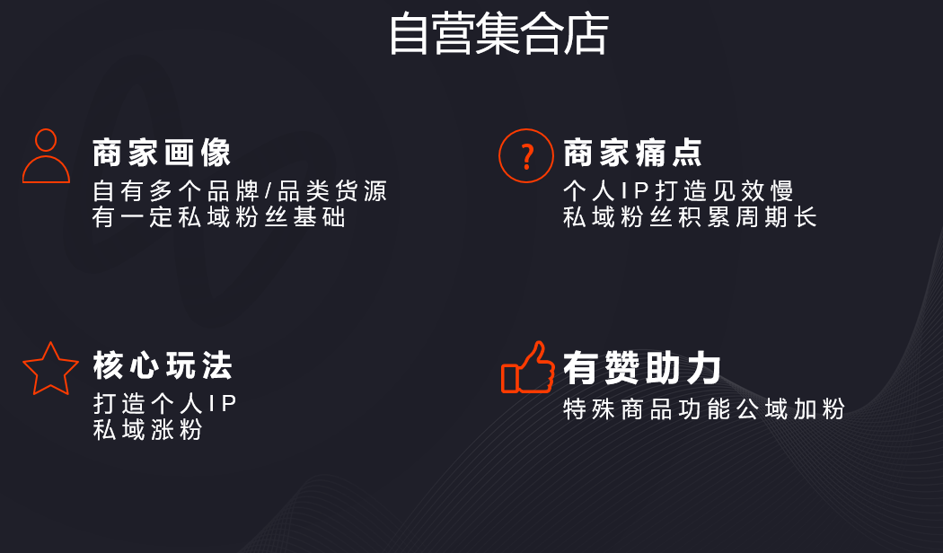 第四类商家是自营集合店型,比如首品团、冰冰轻奢大牌服饰。其核心打造个人IP,但也常常面临个人IP打造见效慢,私域粉丝积累周期长的痛点。对此,有赞能提供“引导直播间用户加好友”等功能,助力视频号主沉淀私域流量。