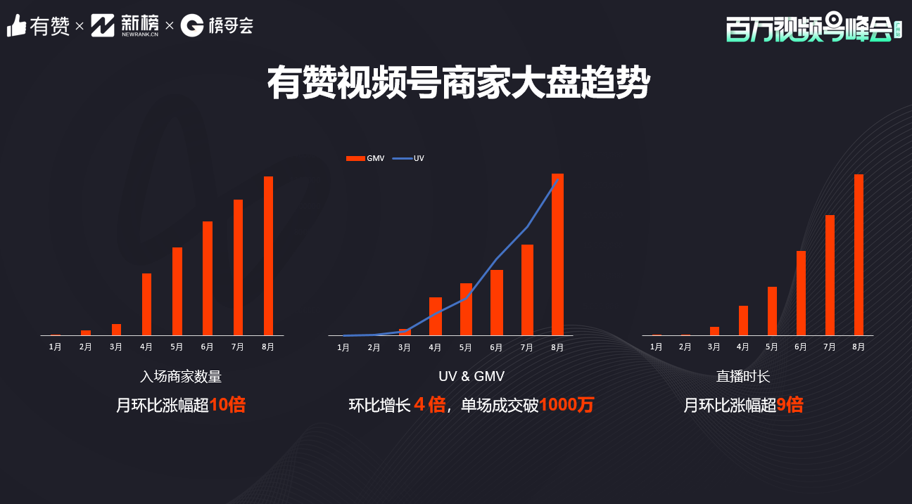 有赞数据显示,截至今年8月,视频号商家入场数增长迅猛,月环比涨幅超过10倍;此外,视频号带货GMV环比增长4倍,直播时长月环比超9倍。