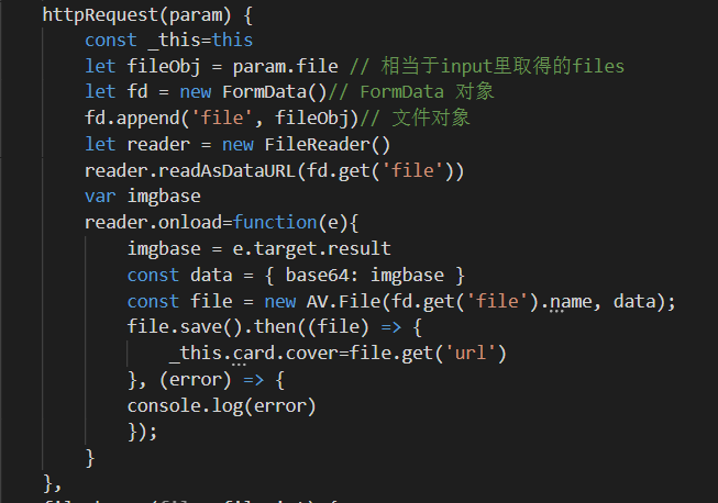 结合文档和博客研究出了使用elmentui+leancloud将本地文件转为base64上传。el-upload的手动上传需要自己写httpRequest函数,本地上传的关键就是写好这个函数。