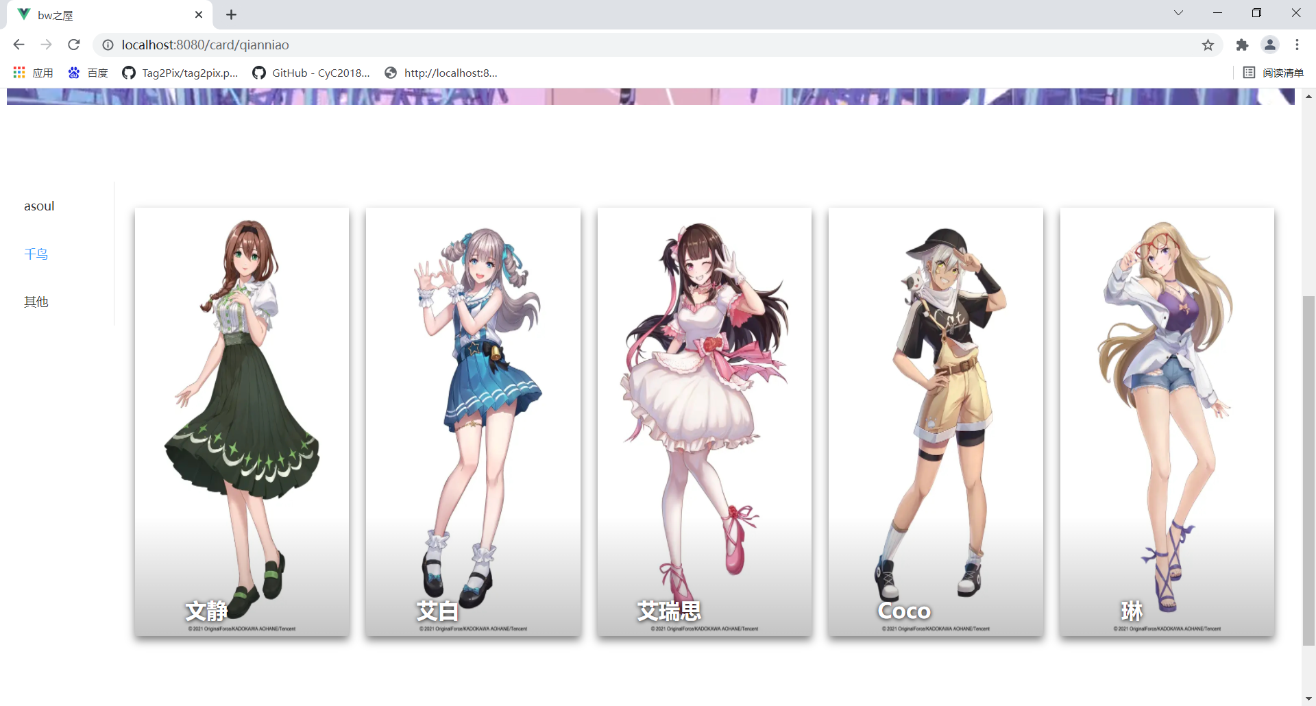 网站的初衷是博客+二次元资料库,因此复制一遍发博客的代码,稍加修改(将数据存储至新的数据库)就是发卡片页了。建的第一个资料库就是阿手(b站搜索贝拉kira,把你的关注给我交了)。展示方面和博客展示一样的思路,图片使用懒加载处理,但使用了网络上的卡片插件(https://www.17sucai.com/pins/38899.html),将鼠标放至卡片上可以有一个上推的阴影效果,非常好看。为适配图片尺寸,将卡片设为横向矩形。ASOUL时代,沸腾期待!(点击查看更多可直达bb空间捏)