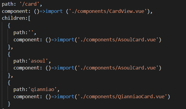 做完阿手下一个就是千鸟了。想着在卡片页面的左侧做一个导航栏,能够切换阿手/千鸟/其他。导航栏使用竖向的el-menu,根路由是/card,点击千鸟路径就变为/card/qianniao。这需要引入嵌套路由,直接上图,在route.js文件中为card设置children属性。