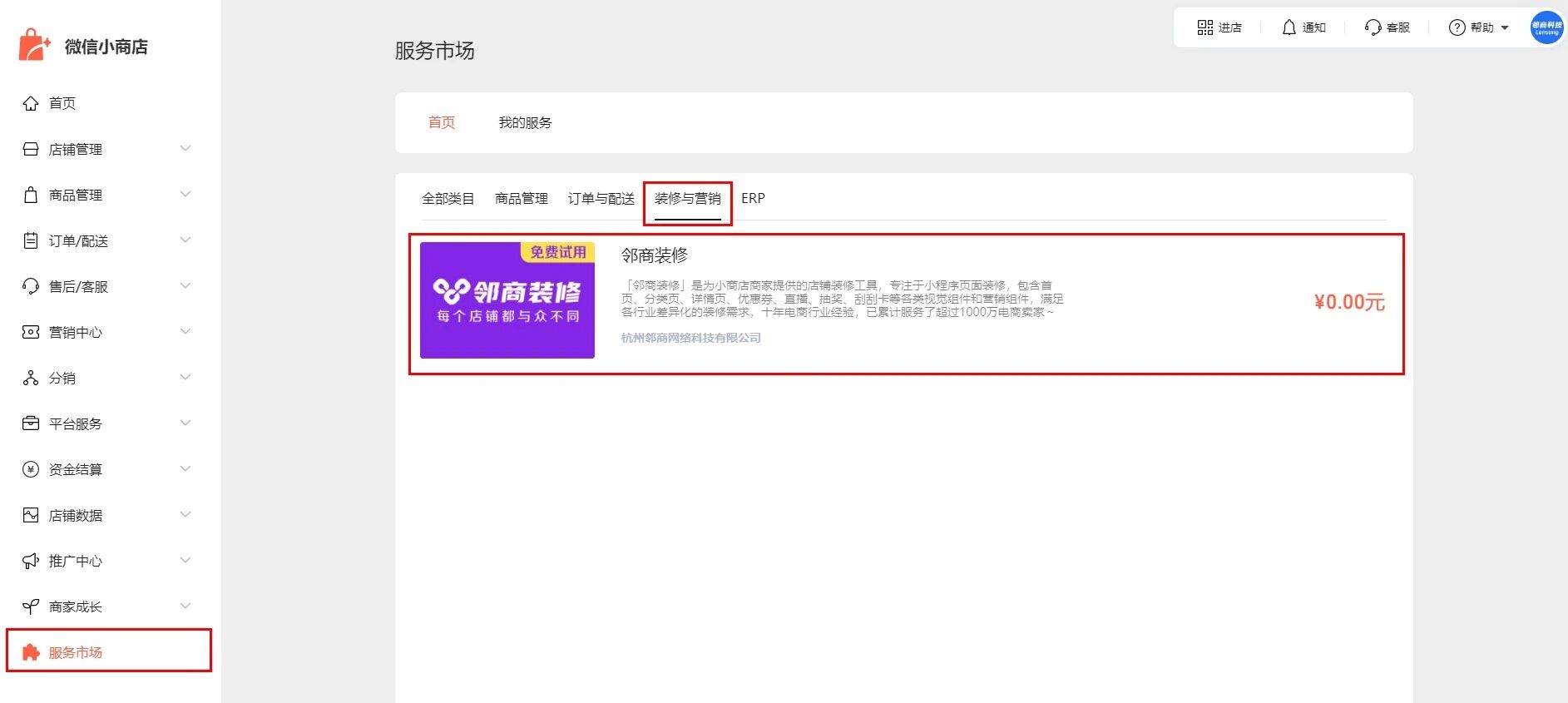 电脑端登录微信小商店后台 https://shop.weixin.qq.com/ ,点击左侧最下菜单栏【服务市场】,点击【我的服务】,找到【邻商装修】点击去使用