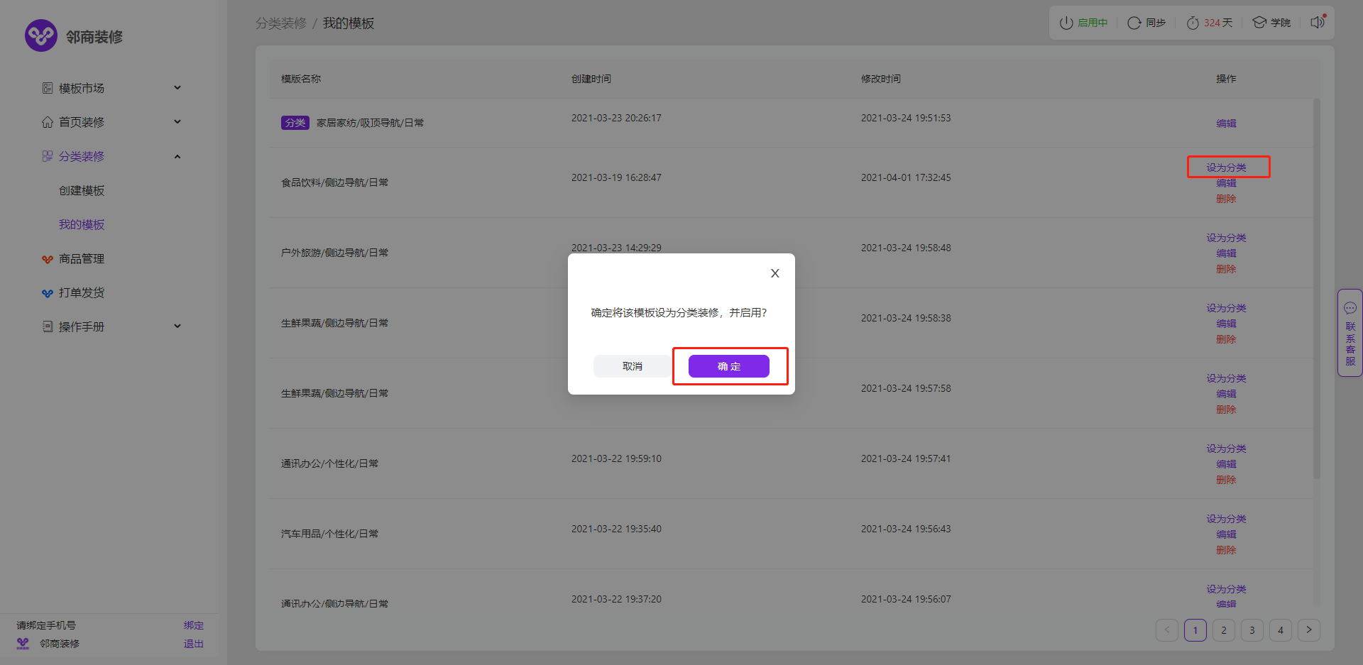 3.2.7 在保存的分类模板中,点击设为分类并确定启用,即可成功启用改分类模板