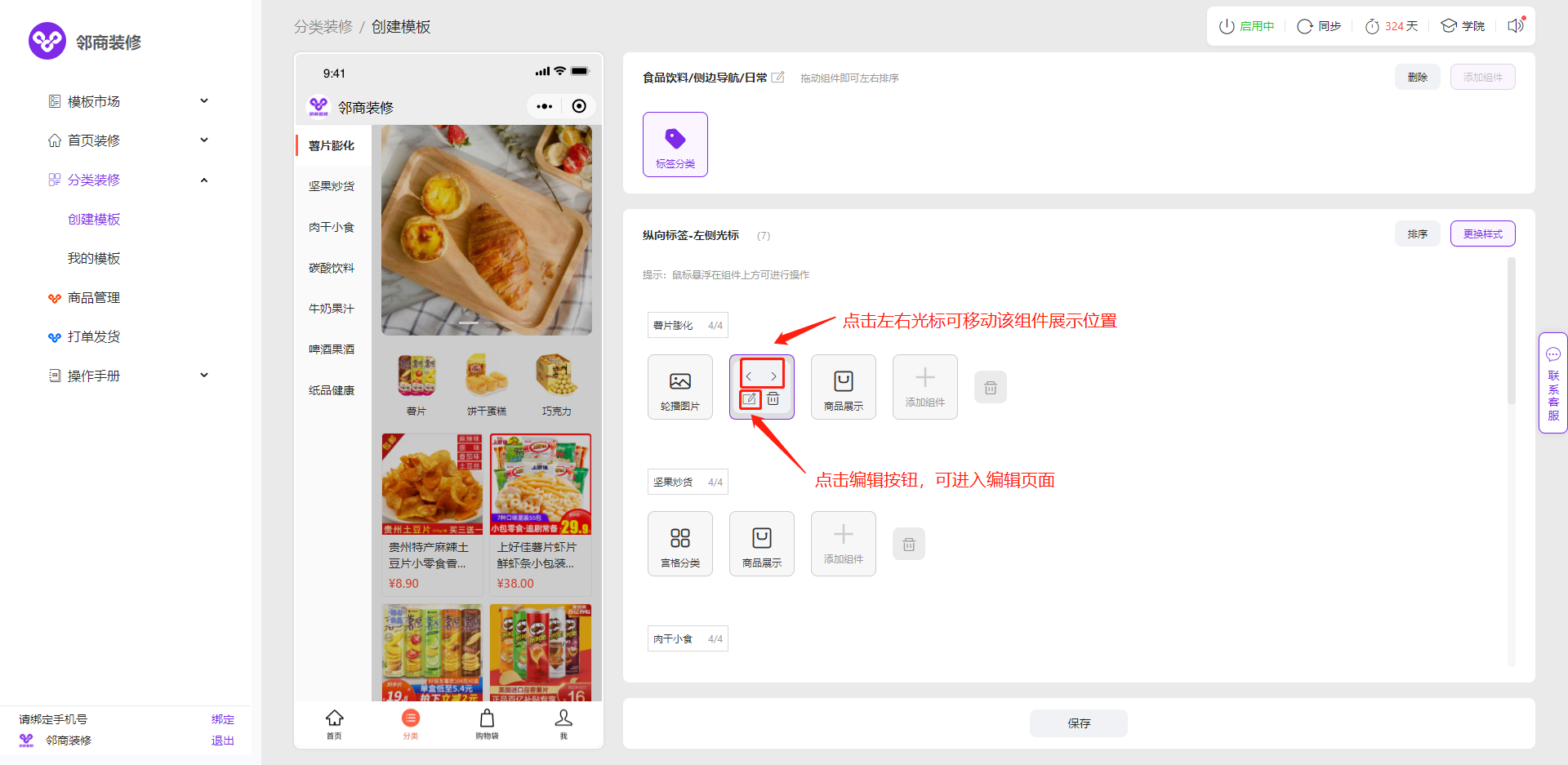 3.2.5 可以按照您的需求进行添加、排序、编辑相应组件内容并关联商品