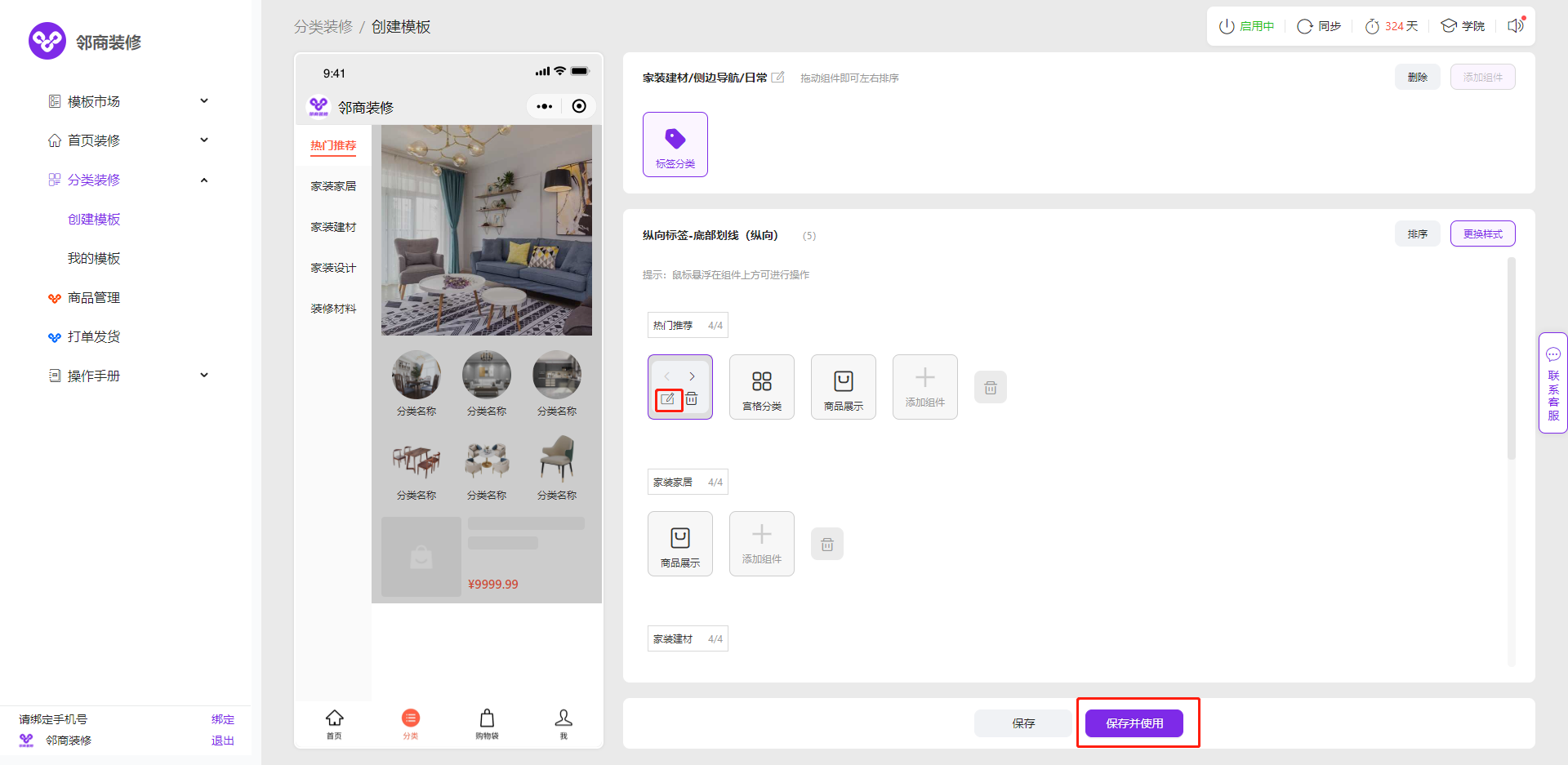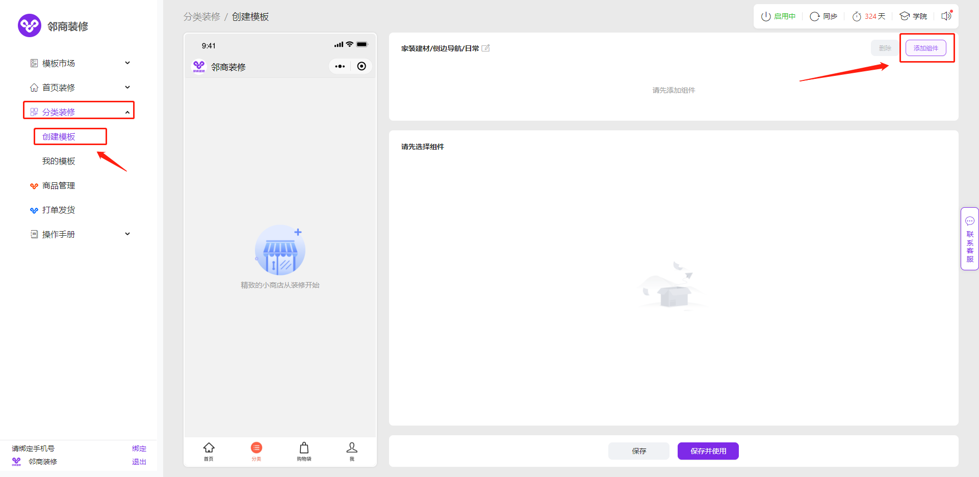 3.1.1 邻商装修模板市场中已经有大量配置好的样式模板,点击【模板市场】-【分类模板】,选择喜欢的模板,点击使用模板