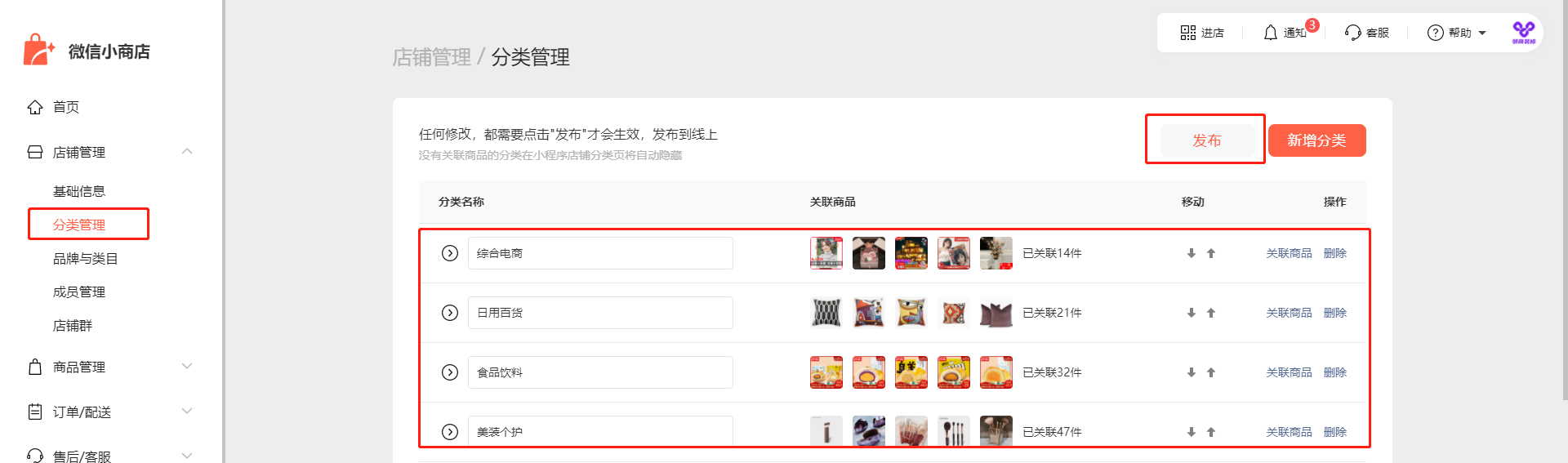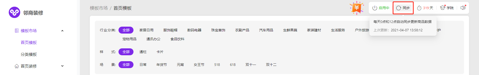 如您使用期间更新了分类或进行了修改操作,点击发布后,需要手动在邻商装修右上角点击-【同步】,同步下最新数据哦~