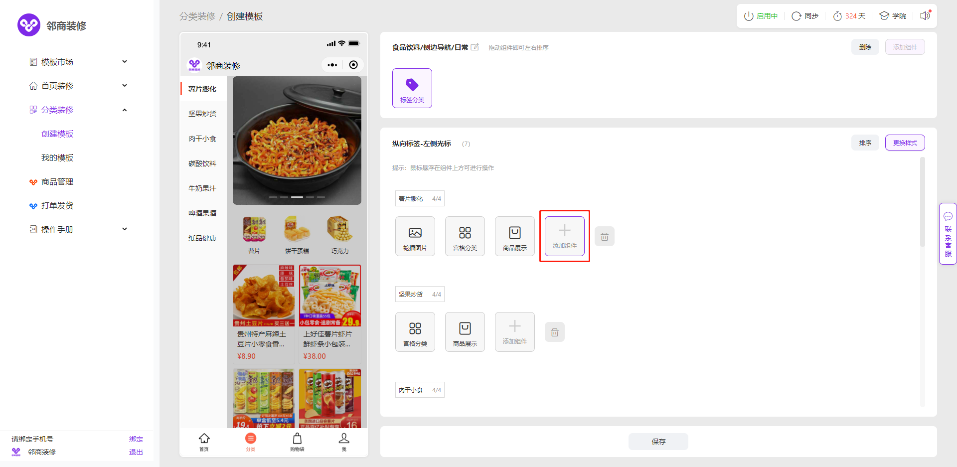 3.2.4 点击标签分类下的【添加组件】按钮,即可添加对应组件,目前共有轮播图片,宫格分类,及商品展示3个组件