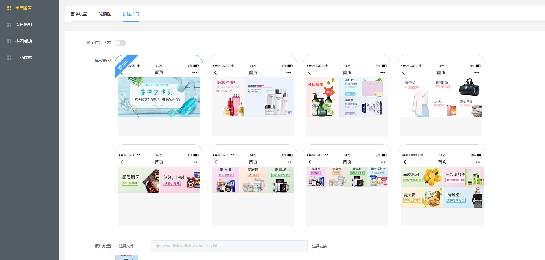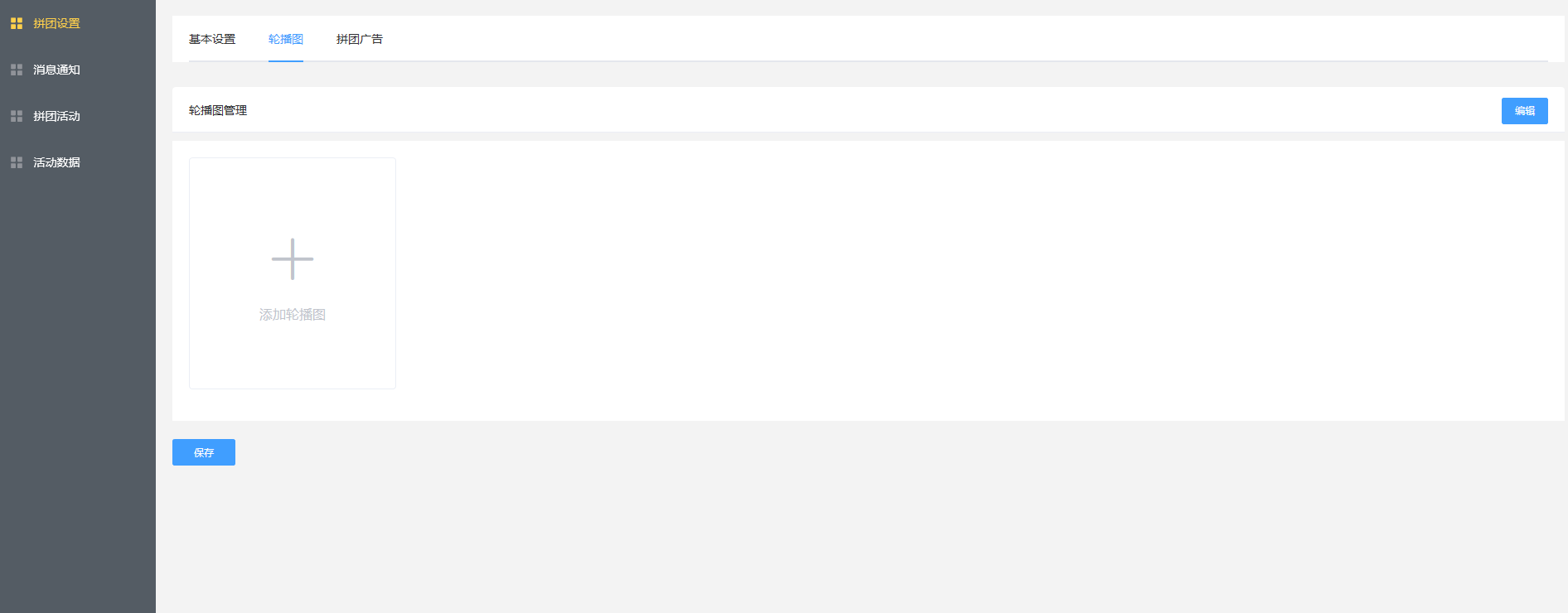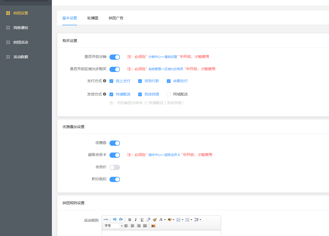 拼团设置分为3块,1基础设置,2轮播图设置,3拼团广告设置