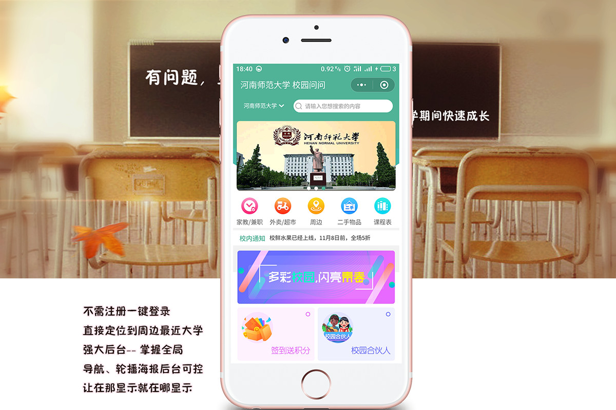 大学生高校生活平台、外卖跑腿、快递代领、周边商家、课程表、教务系统、兼职家教、二手市场