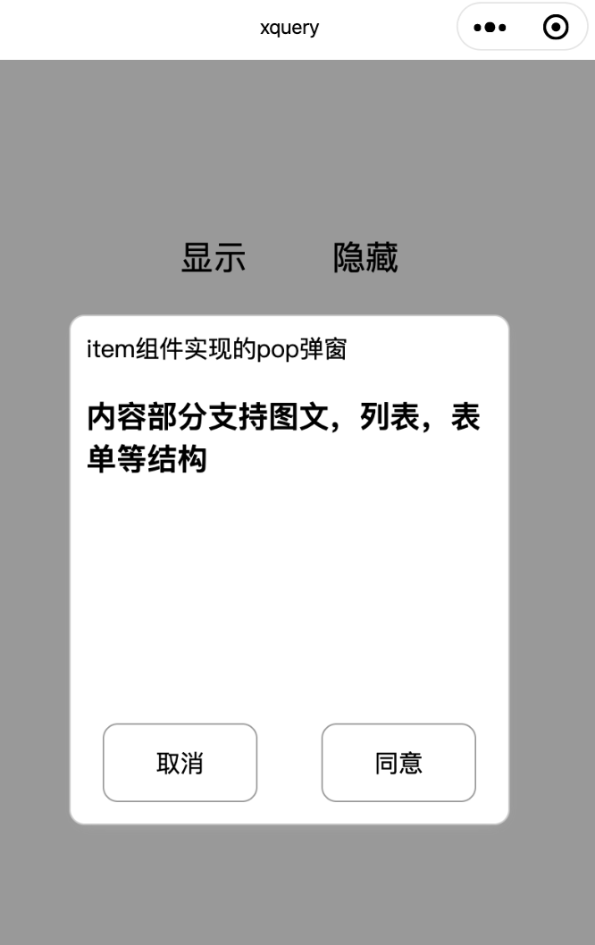 xquery是小程序的工具库,不是ui框架,因为缺少美感,所以xquery的demo基本上都不好看,图片都是我乱找的,xquery的目的是希望设计一套通用型模板远离模板地狱,并能像jq一样有一套灵活的组件交互机制