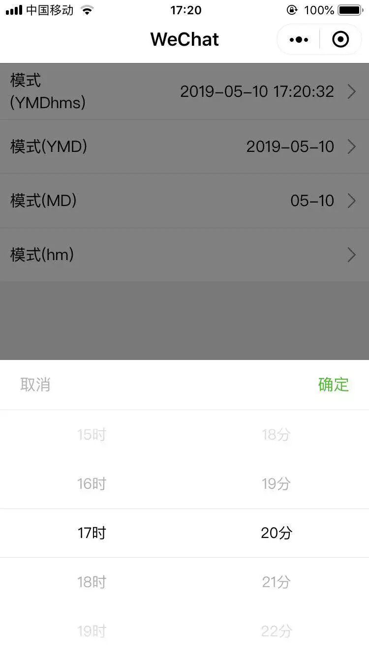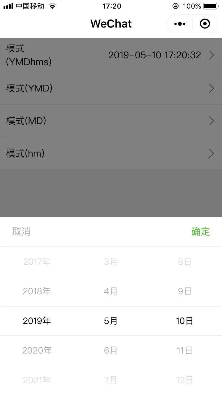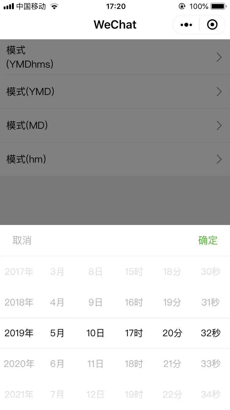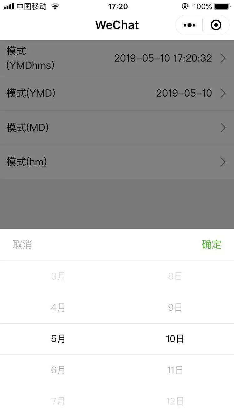 DatePicker分为四个mode:YMDhms(年月日时分秒)、YMD(年月日)、MD(月日)、hm(时分)。