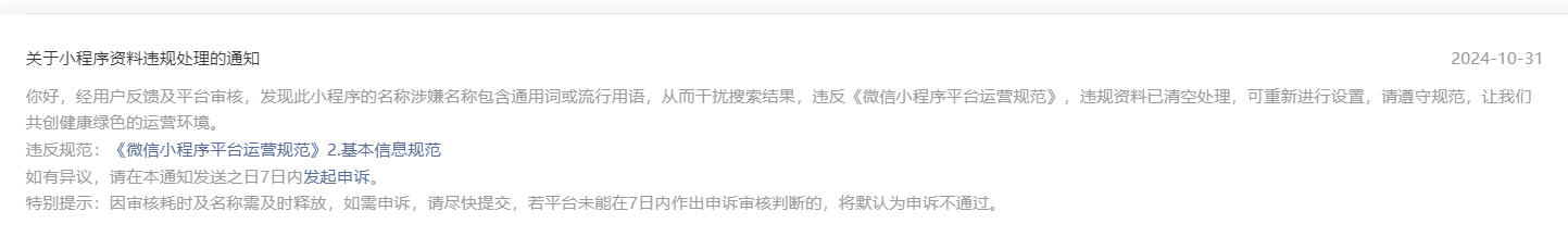 您好,各位朋友。做小程序的朋友。本人小程序于10月31日被举报下线,原因:涉嫌名称包含通用词或流行用语,从而干扰搜索结果