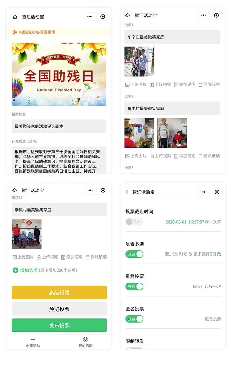 · 高级设置:投票截止时间、单选/多选、重复投票、匿名投票、限制转发、图片水印