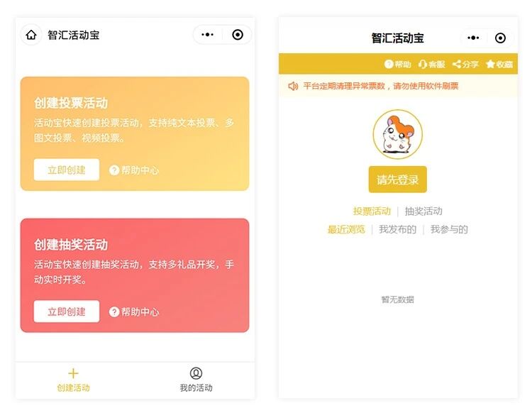 我们打开小程序,底下导航栏两个标识很显眼,一个是创建活动,一个是管理活动,点击创建活动后,选择投票活动创建: