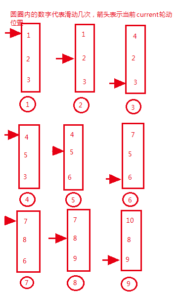 3、视频轮播逻辑规律是:组件是使用三个swiper-item一直做无限滚动(好处就是不会造成过多的节点,性能好),看图:图的意思是滑动轮播的规律:箭头表示当前swiper滑动的位置,然后显示对应的视频,这样轮动排放的逻辑可以知道进可攻,退可守,不会出现上下滑播放顺序就乱了。
