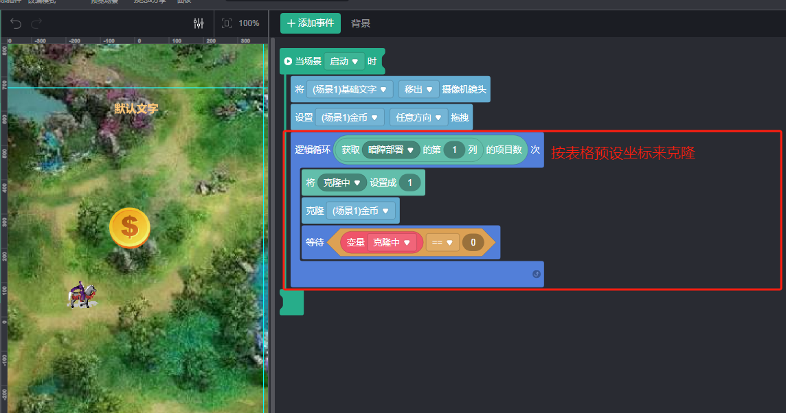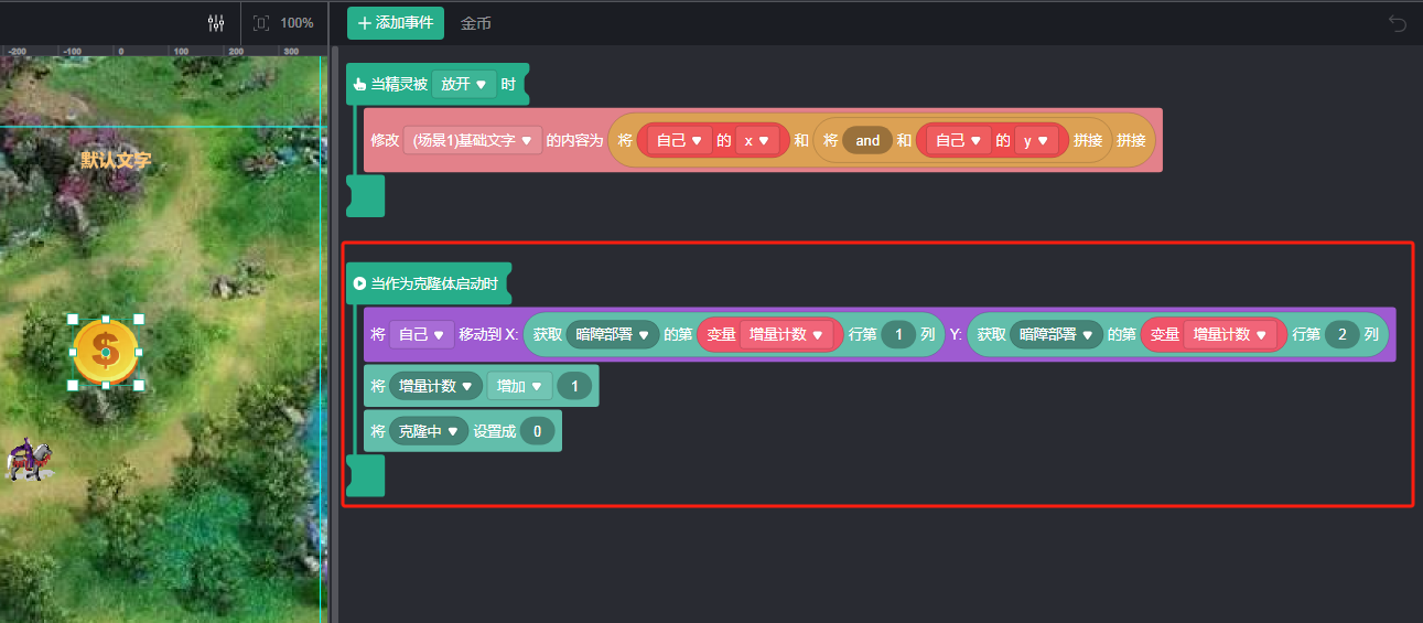 采用暗障来限制角色行动范围,从而构建道路,选一个物体设为固体属性(这里用金币),将其按地图情况来分布克隆体,同时将其透明度设为0(注意:不是隐藏)