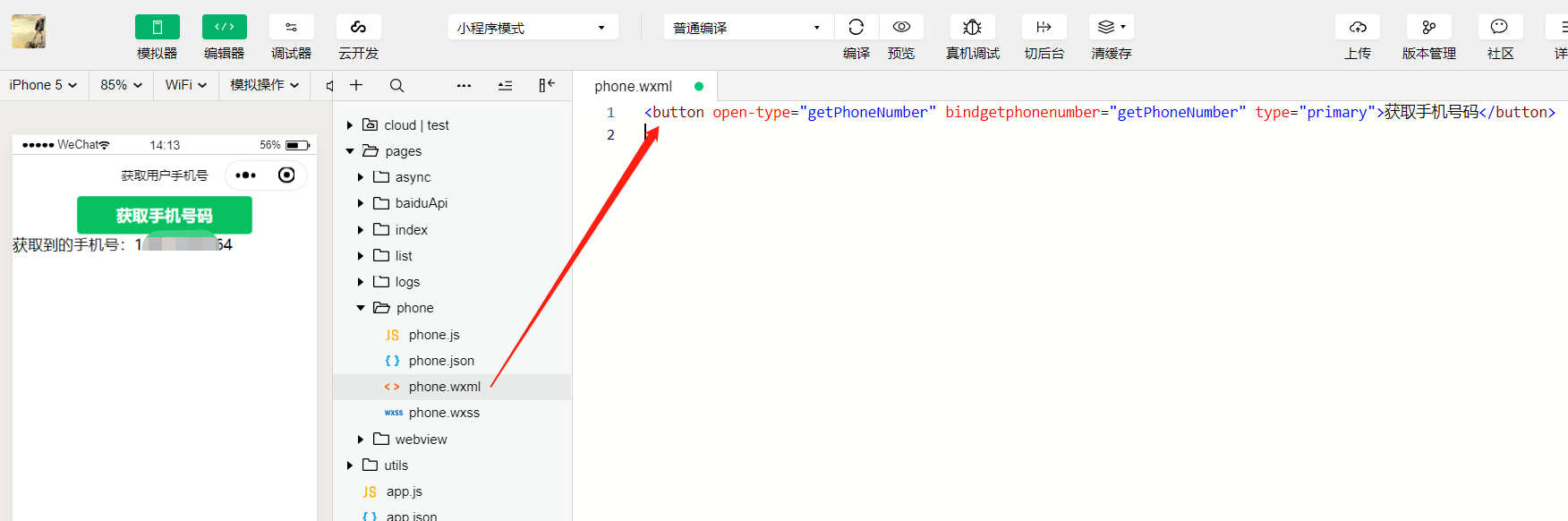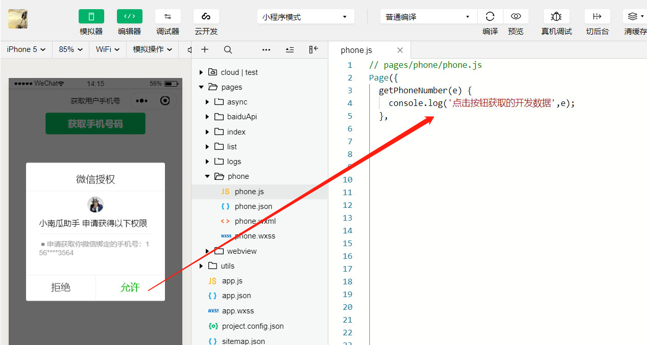 甚至可以说核心代码只有上图红色框里的两行。是的,你没听错,只靠这2行代码,就可以轻松的获取用户小程序绑定的手机号。