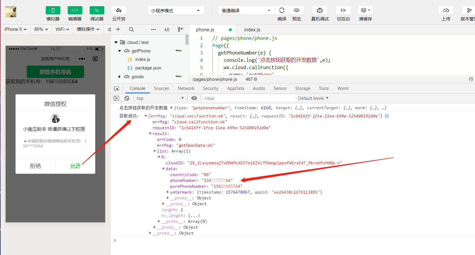 到这里我们就可以轻松的通过云开发获取用户的手机号了,比起传统的后台开发来获取,是不是简单了很多。