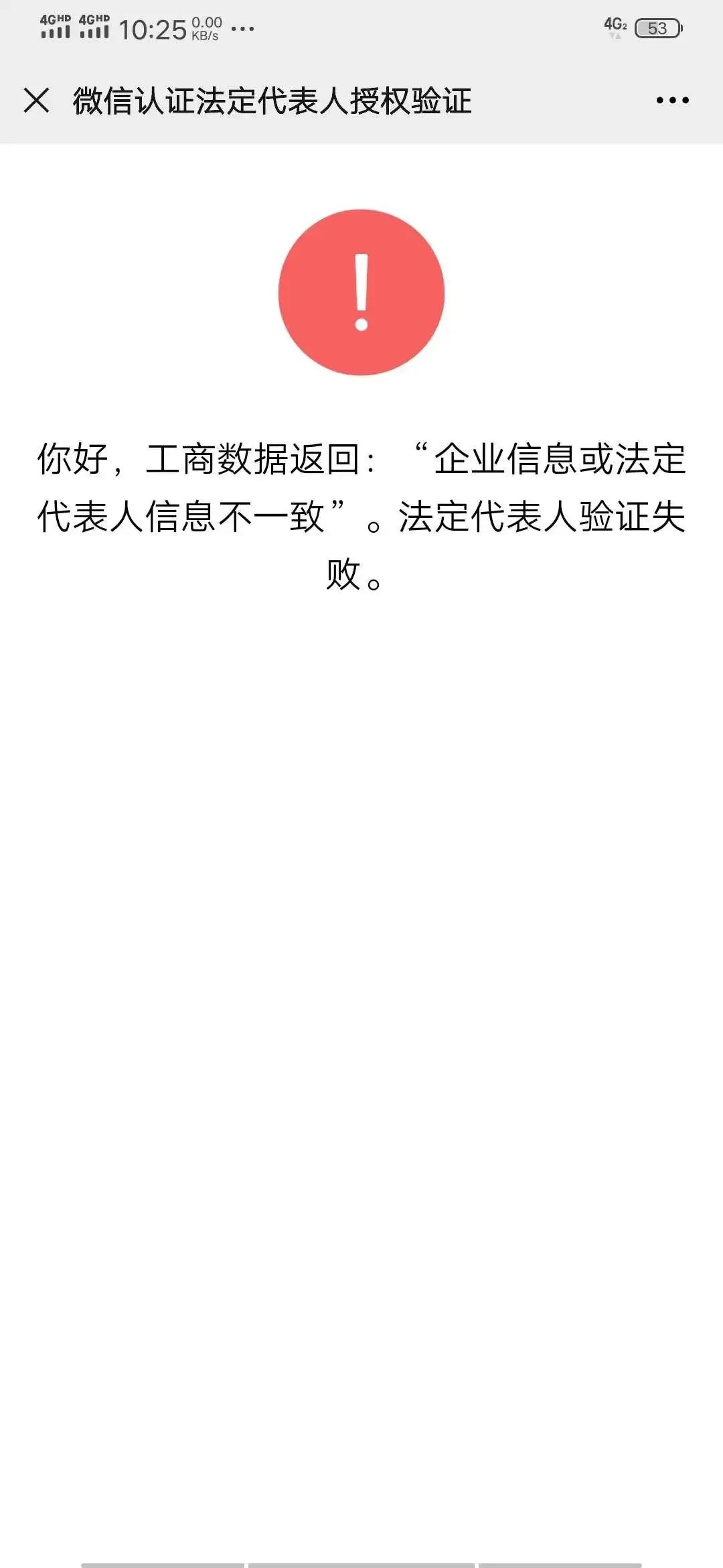 你好,工商数据返回:“企业信息或法定代表人信息不一致”。法定代表人验证失败。请刷新重试;是什么原因?? - 微信开放社区 https://developers.weixin.qq.com/community/develop/doc/0000ae9e4c4c10fea6da7164251c00