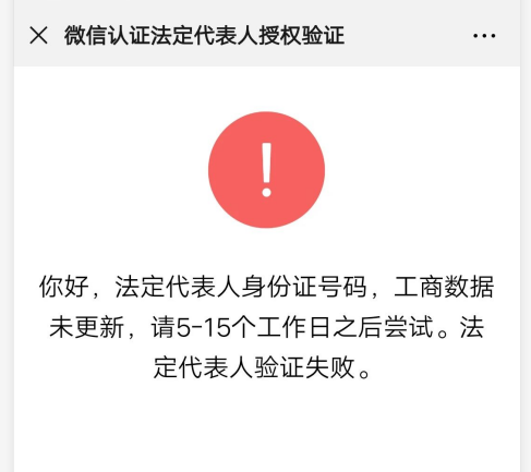 个体工商户类公众号,进行微信认证时,遇到问题“你好,法定代表人身份证号码,工商数据未更新,请5到15个工作日之后尝试。” 请官方看一下:公众号原始id:gh_90a1109dfa83