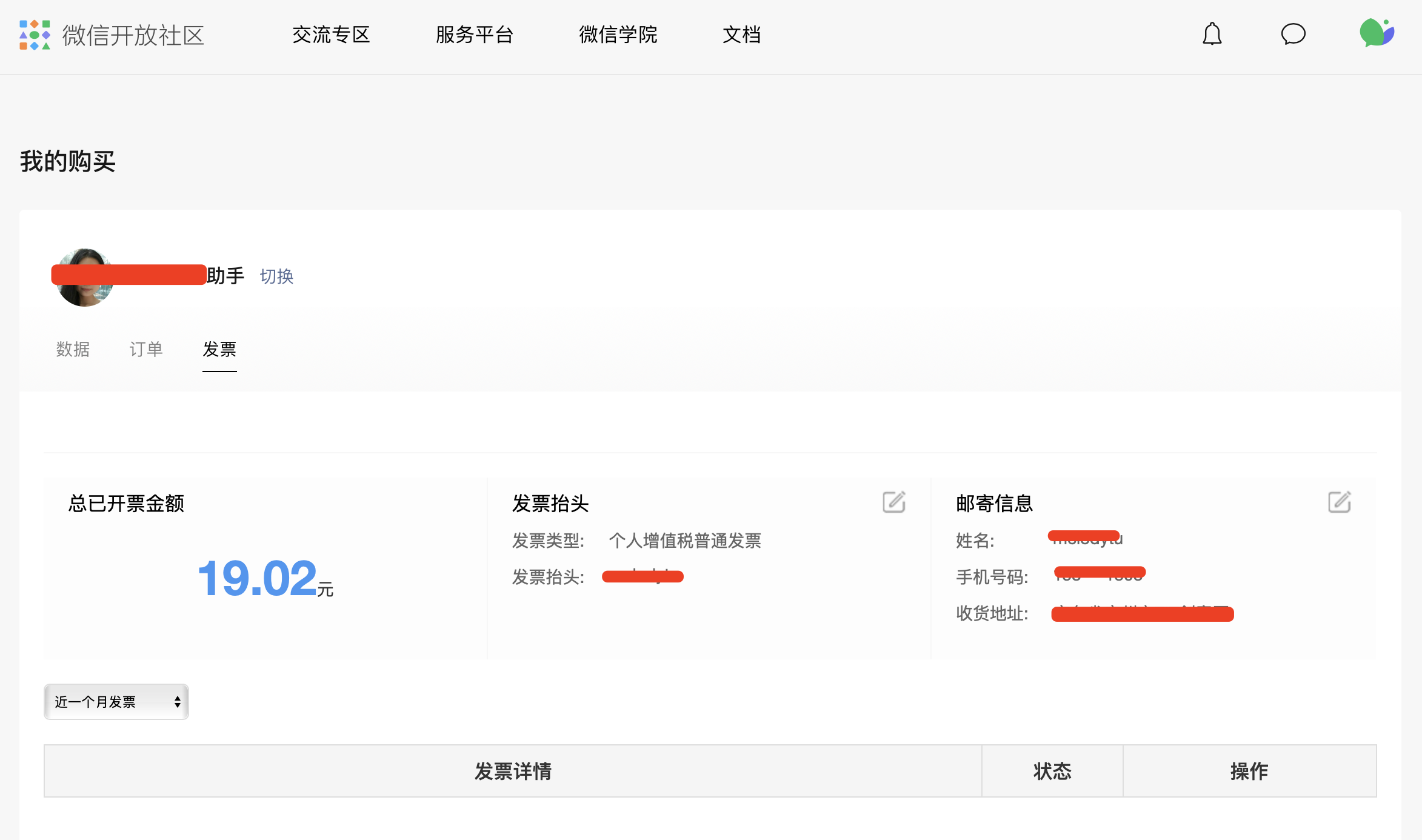 2、点击右上角头像-我的购买-发票,进入发票管理页面