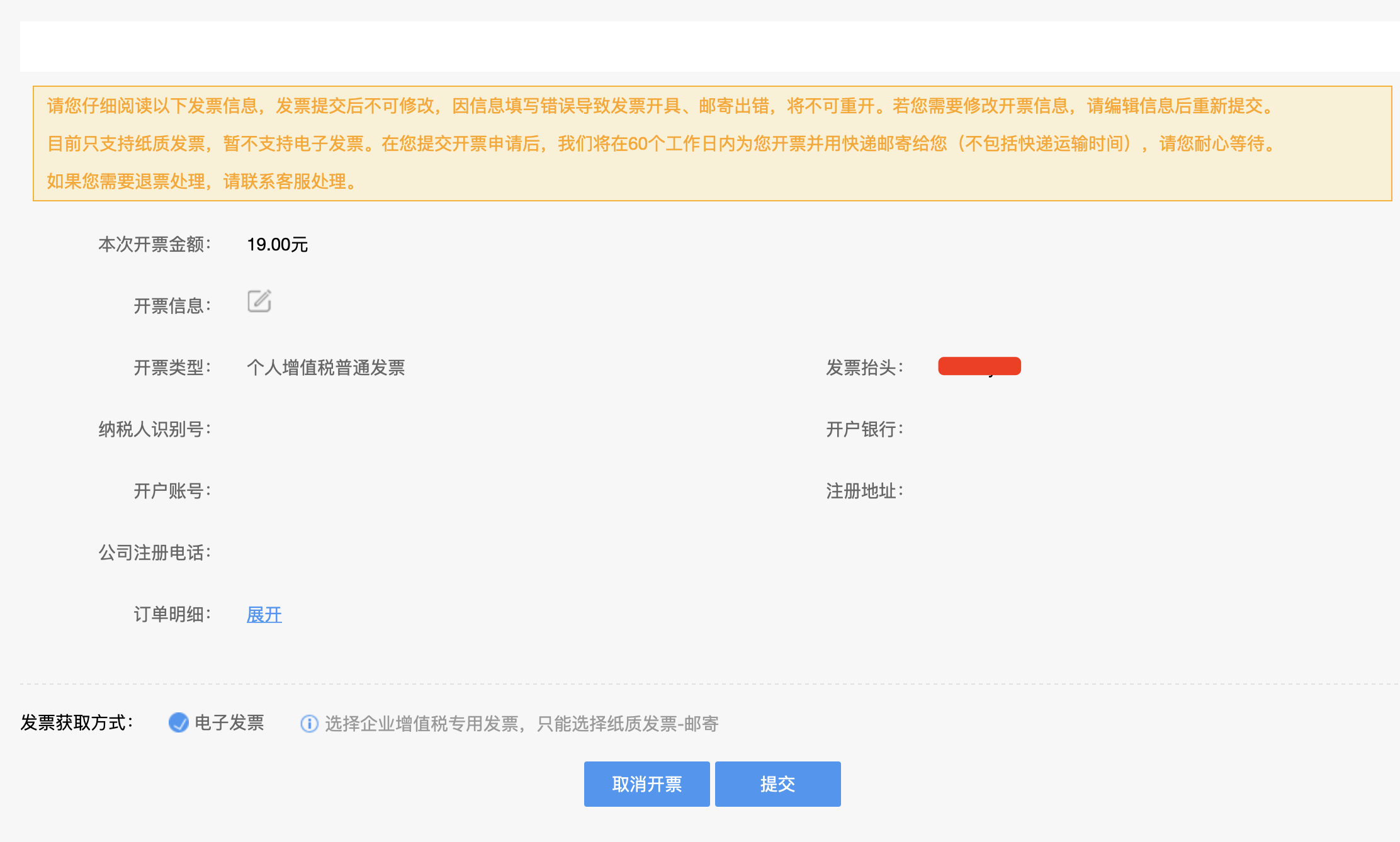 - 发票提交后不可修改,因信息填写错误导致发票开具、邮寄出错,将不可重开。