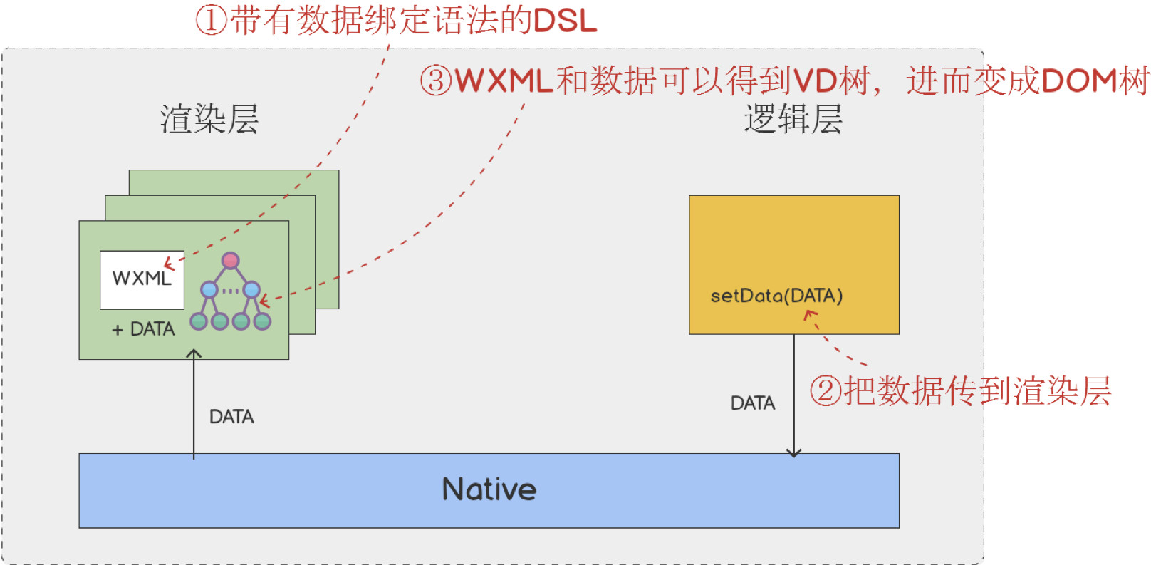渲染层提供了带有数据绑定语法的WXML,逻辑层提供了setData等等API,开发者需要进行界面变化时,只需要通过setData把变化的数据传进去,小程序框架就会进行Dom Diff等流程最后把正确的结果更新在Dom树上。