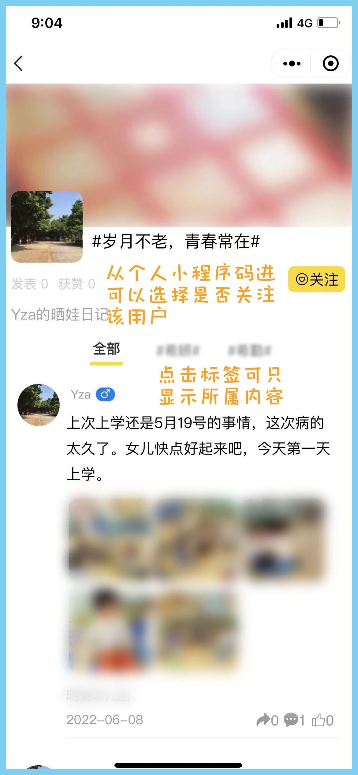 - 个人小程序码分享,别人扫码即可关注自身内容。