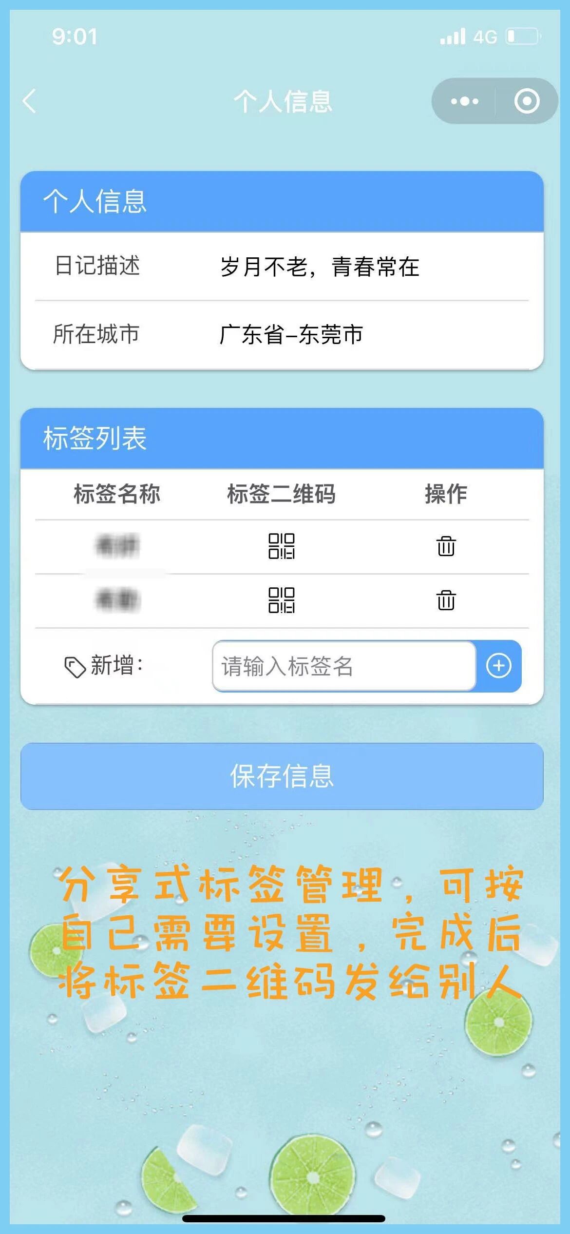 - 自定义标签管理,可共享,共享后可实现多人维护同一日记功能。