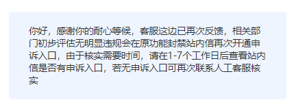大家一定要珍惜站内信的两次申述,如果两次都没通过只能通过客服申诉真的很麻烦