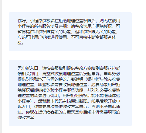 再次提醒:用户没有主动操作相关地理位置的功能不可主动调起查询地理位置的功能,像onLoad和onShow方法中切记不可调用地理位置功能。必须要用户主动触发!!