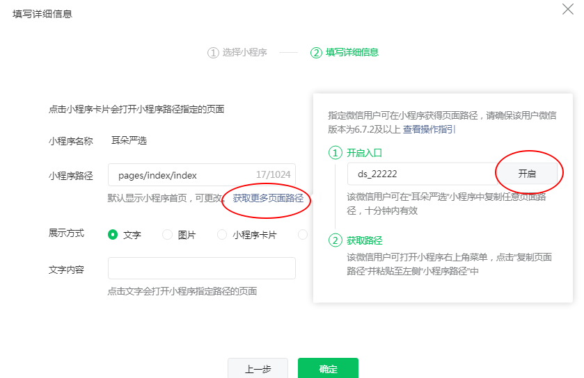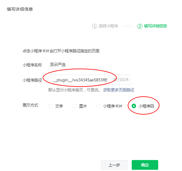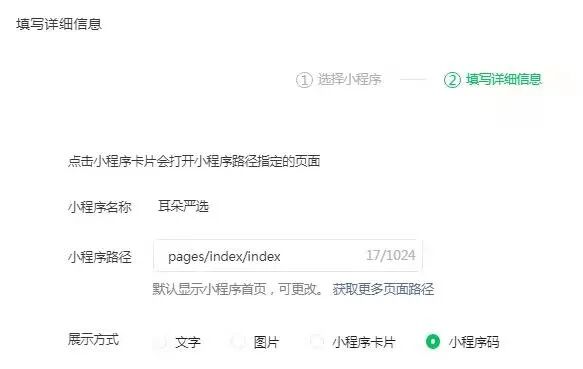 获取小程序路径方法同上,当我们知道了该页面的小程序路径,填入该路径,选择小程序卡片展示即可