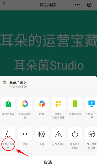 2.在微信内打开小程序找到指定页面,比之前多了一个“复制页面路径”的按钮,点击后复制到小程序路径,展示方式选择小程序码,保存文章。当当当,你心心念想的小程序任意码就出来了!(比如生成好友助力界面)
