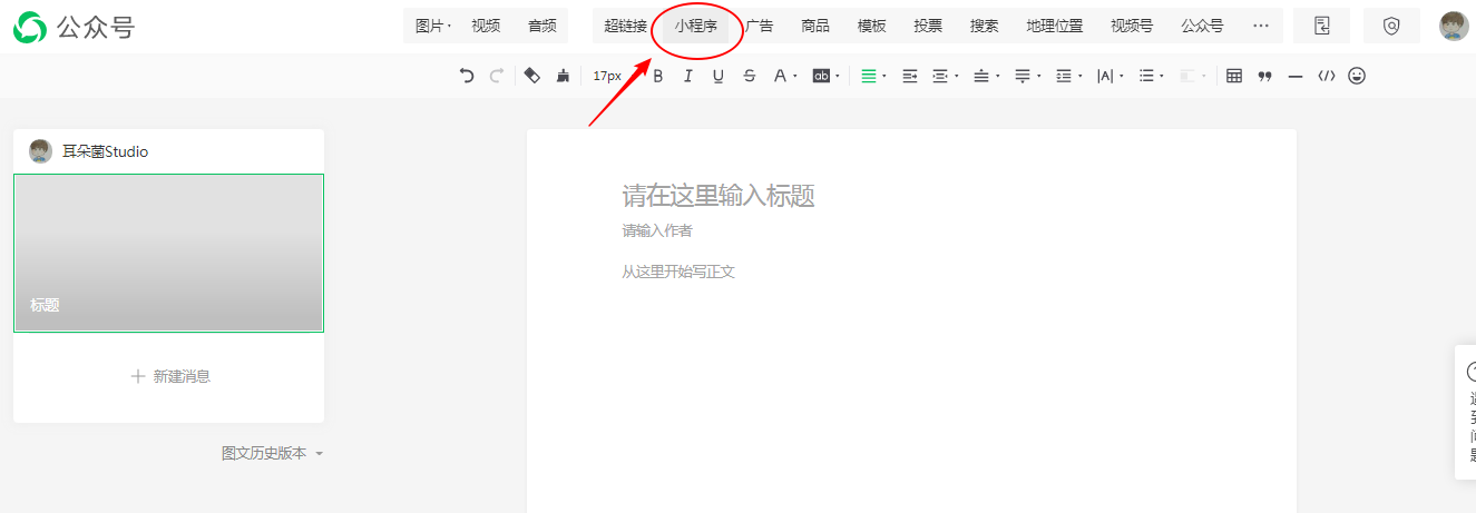 4、分享出来的小程序卡片页面,如何在公号文章内插入该卡片?