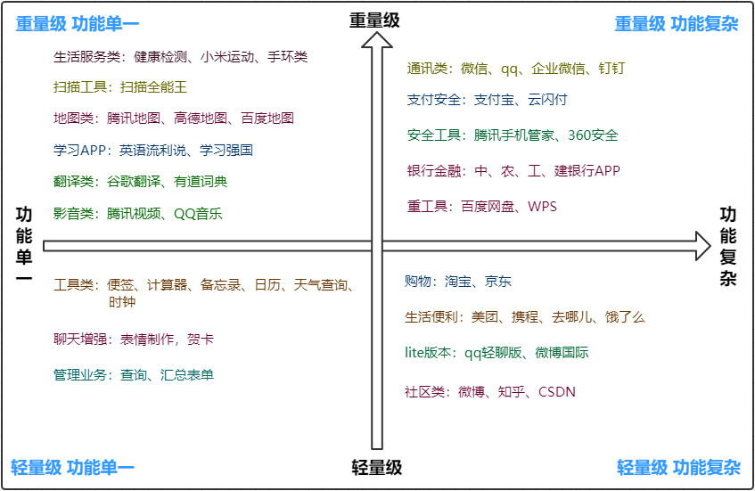 - 微信: 重量级、功能复杂、高频次、刚需