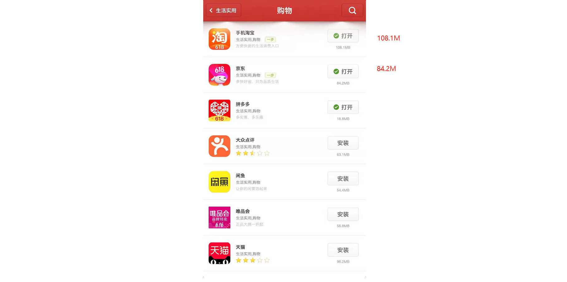 但像淘宝、京东虽然在目前网购时代很流行的阶段,但对于低配版本的手机来讲由于安装所占空间太大,迫不得已只能选择不安装这类软件。所以看大数据,淘宝在低配手机的装机量是很小比例的。有些应用为了满足这类用户的刚需心里,会选择出lite版本。当然,目前小程序逐渐将lite代替了,我们稍后再讨论这个问题。